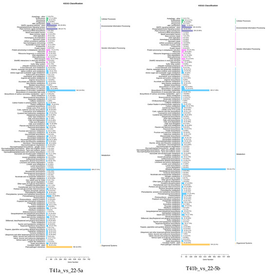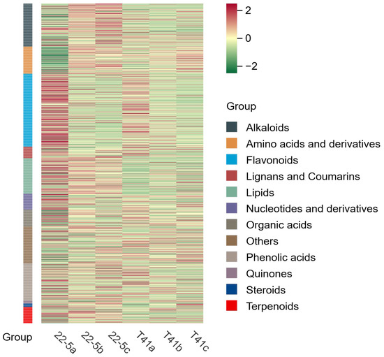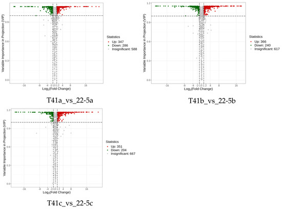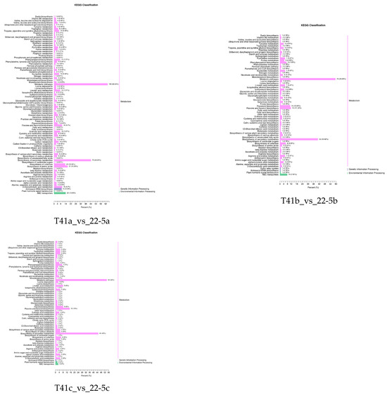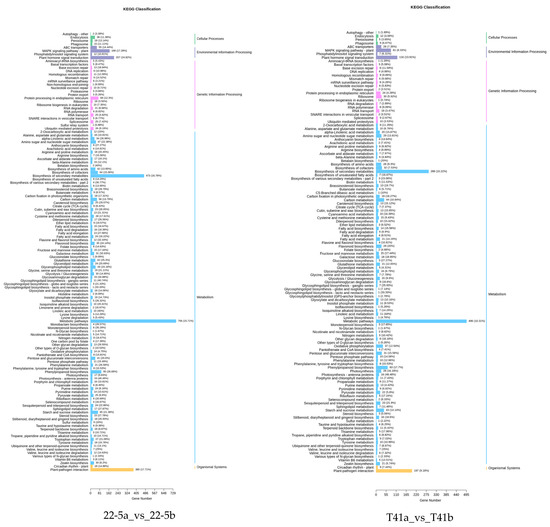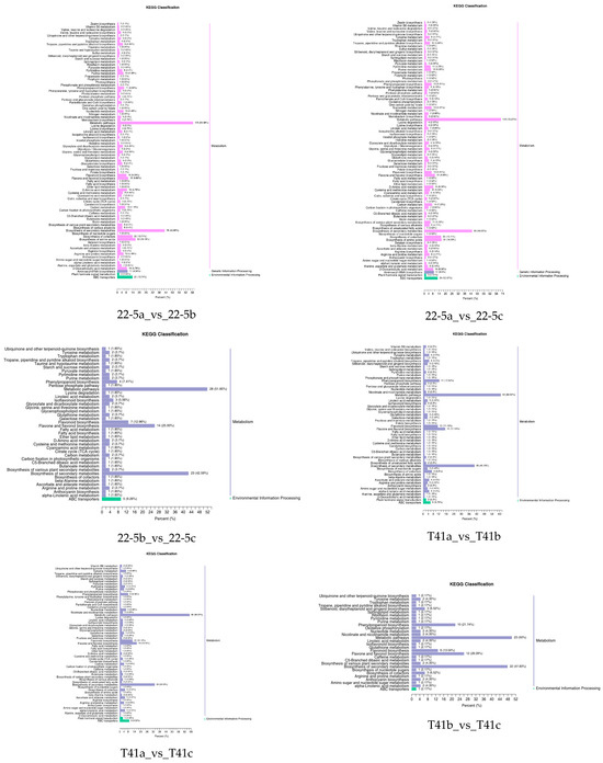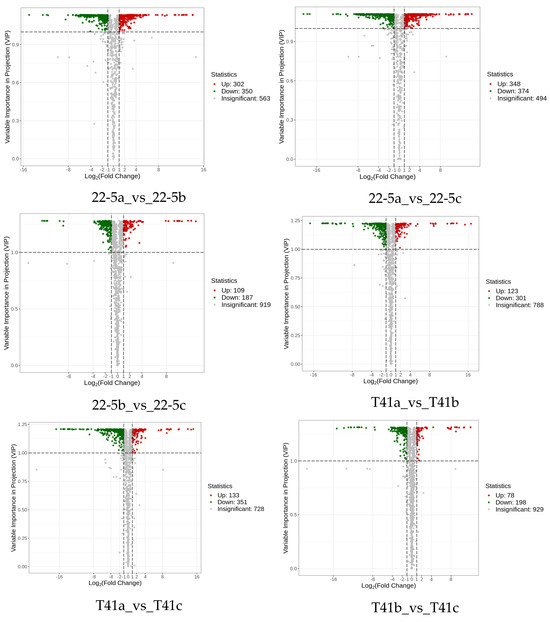 Subsequently, differentially expressed metabolite analysis was performed on the two varieties of peppers at different developmental stages. As we found, a total of 4648 DEMs were identified in the 22-5 variety. Compared with 22-5a, 302 metabolites were up-regulated and 350 were down-regulated in 22-5b. In the 22-5a vs. 22-5c comparison group, 348 metabolites were up-regulated and 374 were down-regulated in 22-5c. In the 22-5b vs. 22-5c comparison group, a total of 296 DEMs were identified, among which 109 were up-regulated and 187 were down-regulated in 22-5c. In the T41 variety, compared with T41b, 123 metabolites were up-regulated and 301 were down-regulated in T41a. In the T41a vs. 22-5a comparison group, 347 metabolites were up-regulated and 286 were down-regulated in 22-5a. In the T41b vs. 22-5b comparison group, 626 DEMs were identified, among which 366 were up-regulated and 260 were down-regulated in 22-5b. In the T41c vs. 22-5c comparison group, 351 metabolites were up-regulated and 204 were down-regulated in 22-5c (Figure 4).