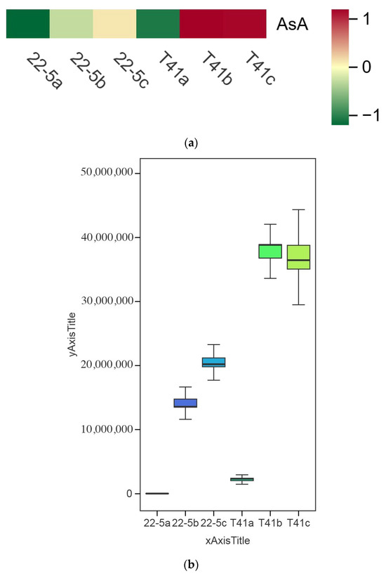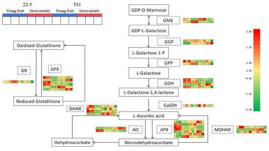 Compared with the T41a group, five genes were significantly up-regulated (including one AO gene, two APX genes, and two GPX genes in the 22-5a group), and a total of five genes were significantly down-regulated (including one GGP gene, one DHAR gene, one AO gene, one MDHAR gene, and one GPX gene) in the 22-5a group. Compared with the T41b group, the 22-5b group showed a significant increase in the expression of four genes, namely one GME gene, one AO gene, and two APX genes. A total of three genes were significantly down-regulated, including one AO gene, one MDHAR gene, and one GPX gene. In the T41a vs. T41b comparison group, four genes were significantly down-regulated, namely one AO gene, two APX genes, and one GPX gene. In the 22-5a_vs_22-5b comparison group, nine genes were differentially expressed, among which only one GGP gene was up-regulated, while eight genes were down-regulated, including one DHAR gene, one AO gene, three APX genes, and three GPX genes (Table 1).
