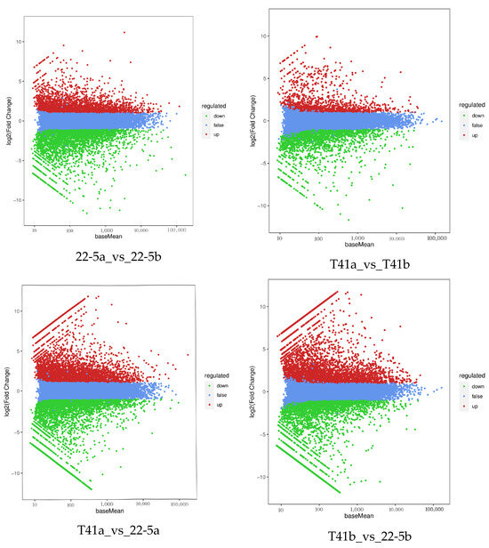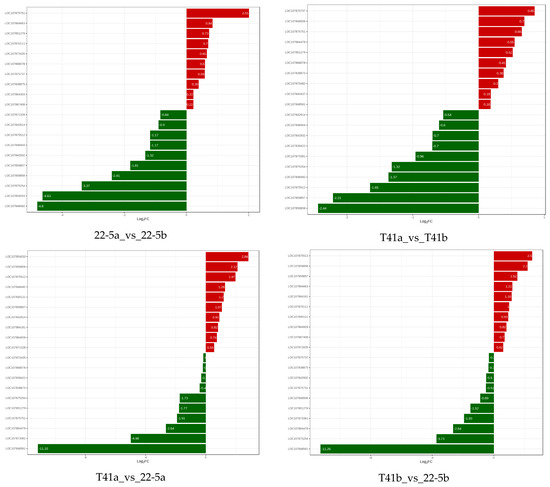Meanwhile, compared with 22-5a, LOC107875751 was significantly up-regulated, and LOC107875512, LOC107859857, LOC107848404, LOC107842932, LOC107859857, LOC107859858, LOC107875254, LOC107854033, and LOC107848492 were significantly down-regulated in the 22-5b group. In the T41a vs. T41b group, LOC107875254, LOC107848492, LOC107875512, LOC107859857, and LOC107859858 were significantly down-regulated. In the T41a vs. 22-5a group, LOC107854033, LOC107859858, LOC107875512, LOC107848492, LOC107840121, and LOC107859857 were significantly up-regulated, while LOC10785254, LOC107851279, LOC10785751, LOC107864479, LOC107873361, and LOC107848561 were significantly down-regulated.