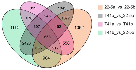 Transcriptomic analysis was concentrated on the young fruit and green ripe stages, as the differences in pericarp AsA content between the two types were most pronounced during these phases. The 24,433 DEGs were identified in the four comparison groups of T41a_vs_22-5a, T41b_vs_22-5b, 22-5a_vs_22-5b, and T41a_vs_T41b. In the 22-5a vs. 22-5b comparison group, 2662 genes were up-regulated and 3546 genes were down-regulated in 22-5b. In T41a vs. 22-5a, 3845 genes were up-regulated and 3733 genes were down-regulated in 22-5a. In T41a vs. T41b, 1323 genes were up-regulated and 2187 genes were down-regulated in the T41b group. Transcriptomic comparison between T41b and 22-5b revealed 7137 DEGs, with 3745 up-regulated and 3392 down-regulated in line 22-5b (Figure 8). Further analysis of these DEGs using Venn diagrams identified 904 common candidates (Figure 9).
