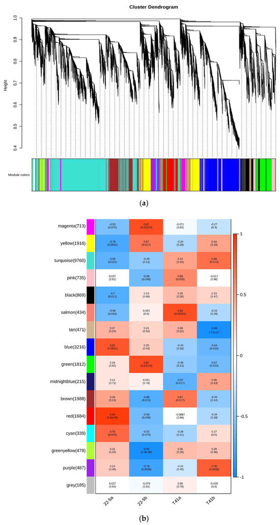 As illustrated in the dendrogram (Figure 11a), a total of 16 modules were identified, each represented by a unique color and composed of genes with similar expression trends. The expression pattern of each module was summarized by its eigengene, which captures the dominant expression profile of the module. These eigengenes exhibited distinct associations with specific tissue types, reflecting tissue-specific gene expression.