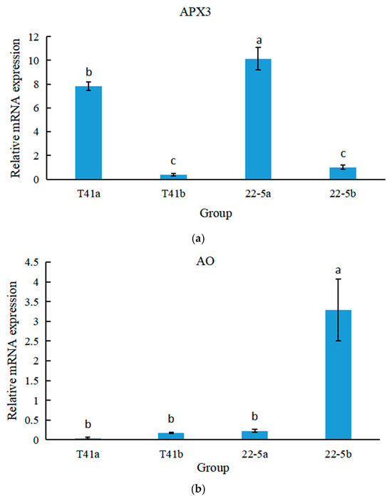 In the T41b_vs_22-5b group, LOC107875512, LOC107859858, LOC107859857, LOC107864663, LOC107864161, and LOC10780111 were significantly up-regulated, while LOC107851279, LOC107873361, LOC107864479, LOC10785254, and LOC107848561 were significantly down-regulated. Finally, two genes, LOC107875512 and LOC107859857, were obtained and translated into AO and APX, respectively (Figure 13).