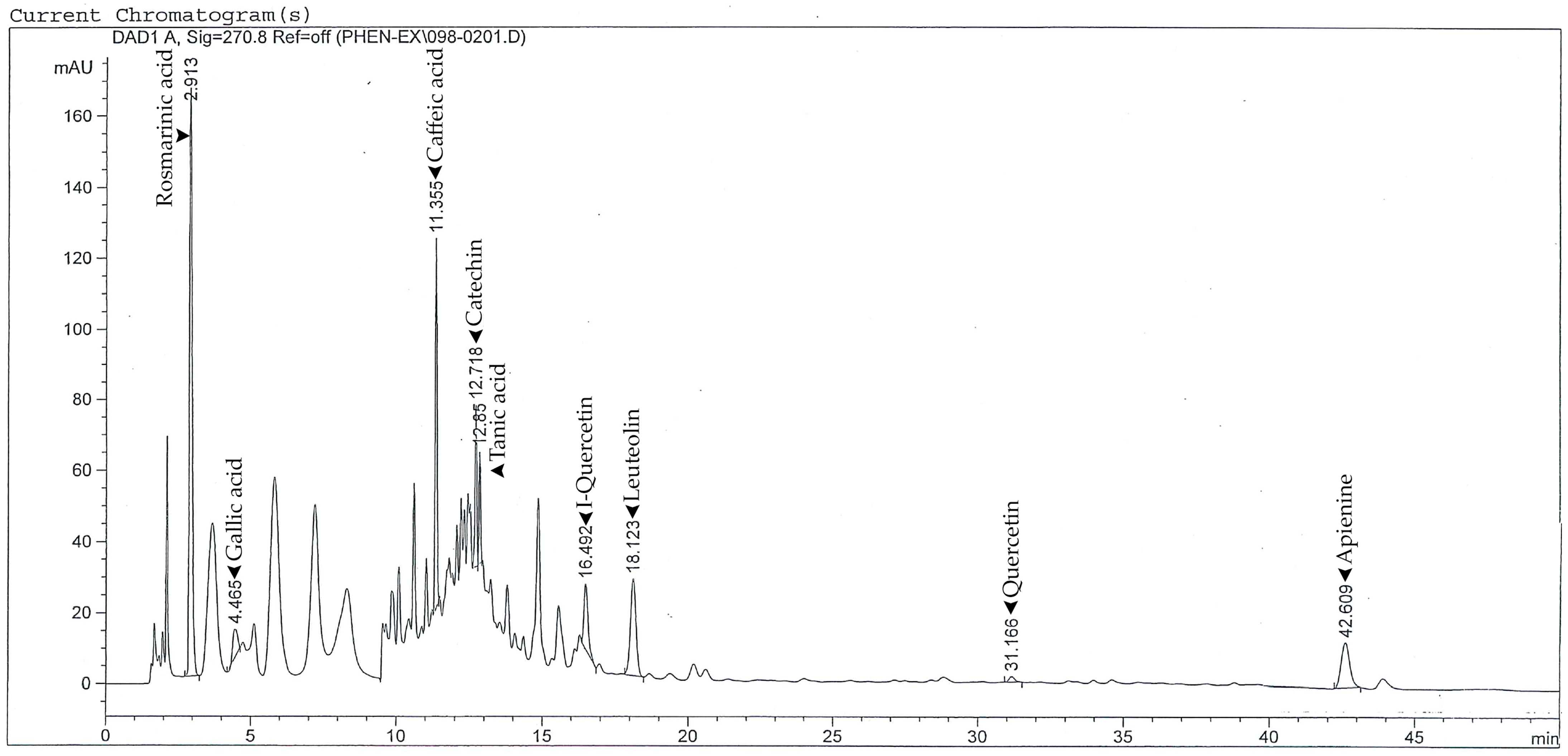 | Gallic acid | 24.89 ± 1.93 | µg/g dry weight | 0.002 g% |