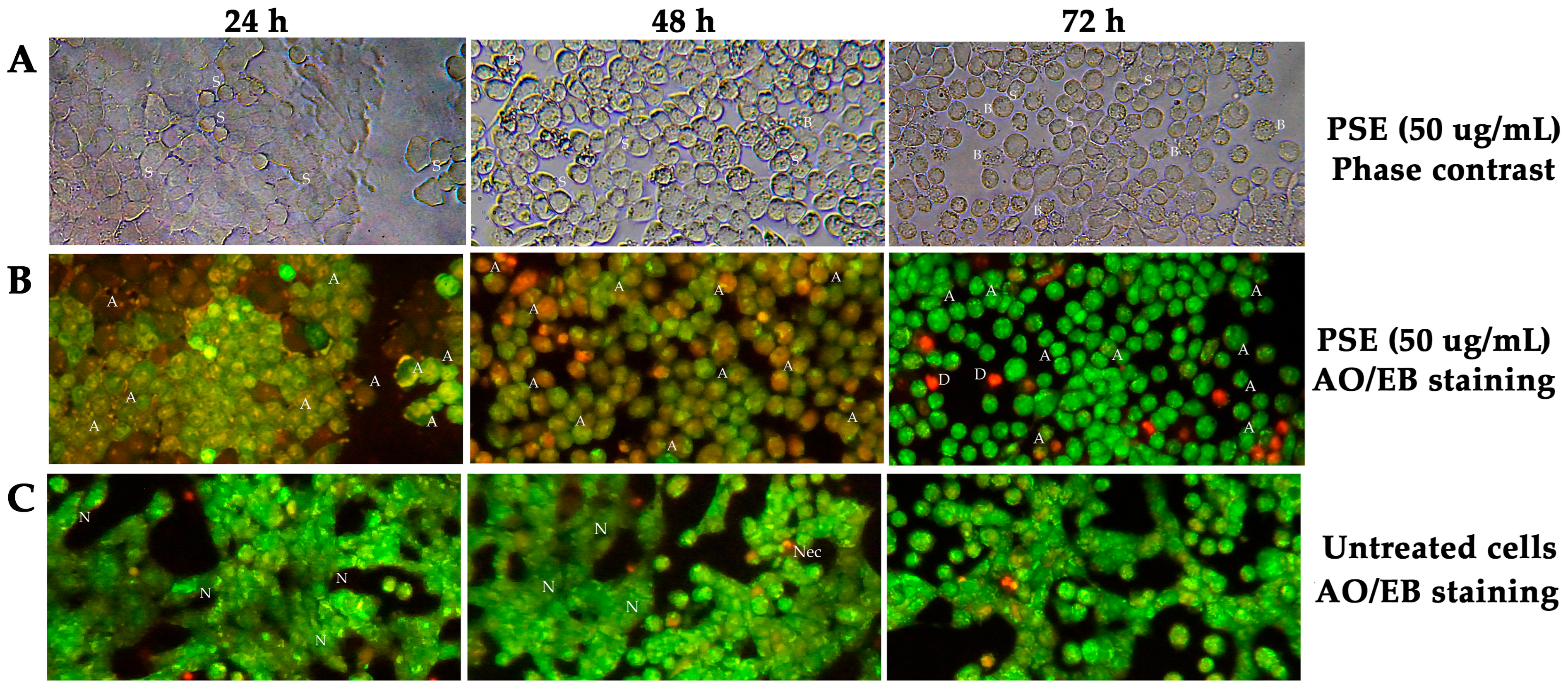 2.9. Morphological Changes, Acridine Orange/Ethidium Bromide Staining (AO/EB)