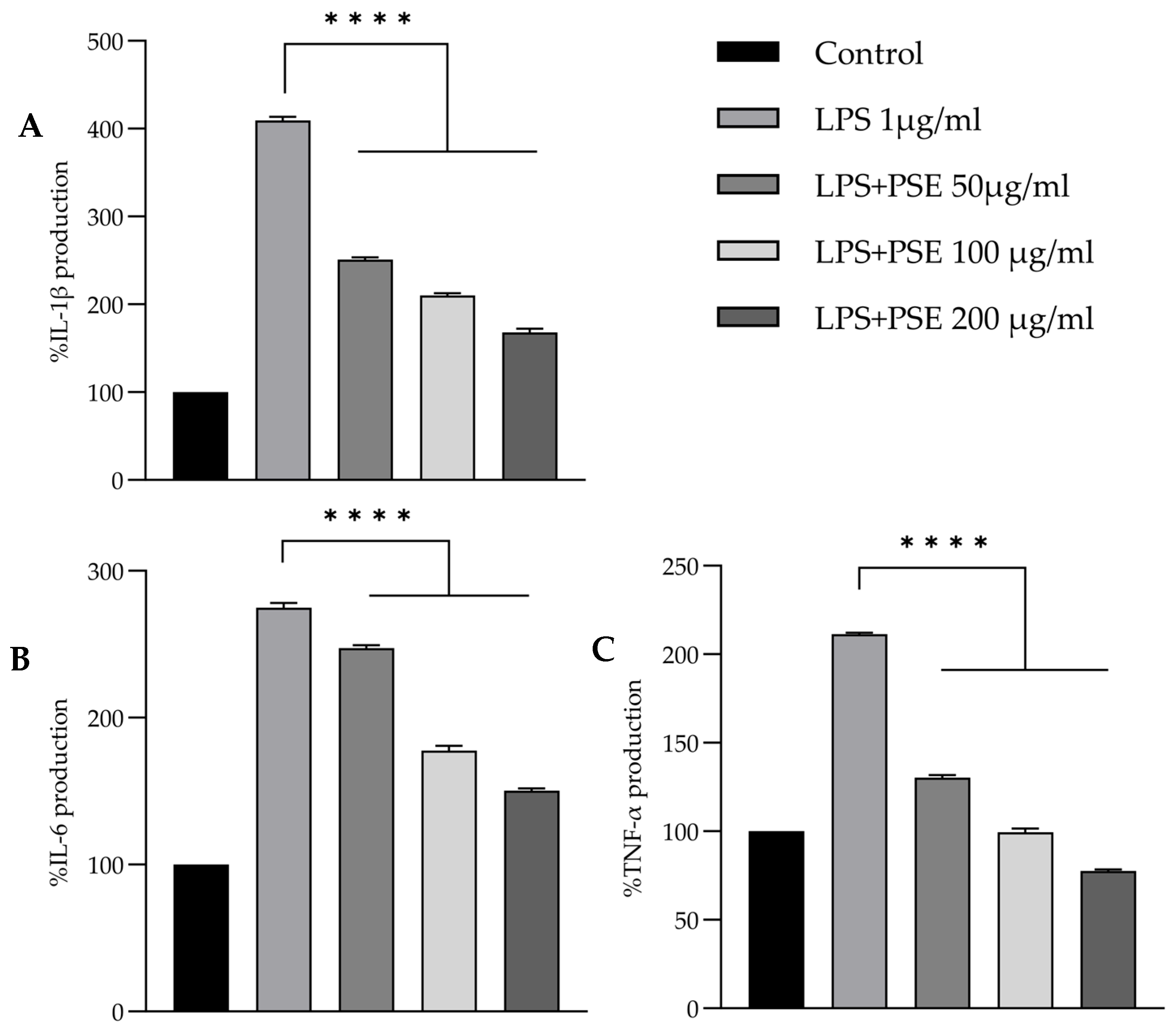 3.6. Effect on Pro-Inflammatory Cytokine Secretion