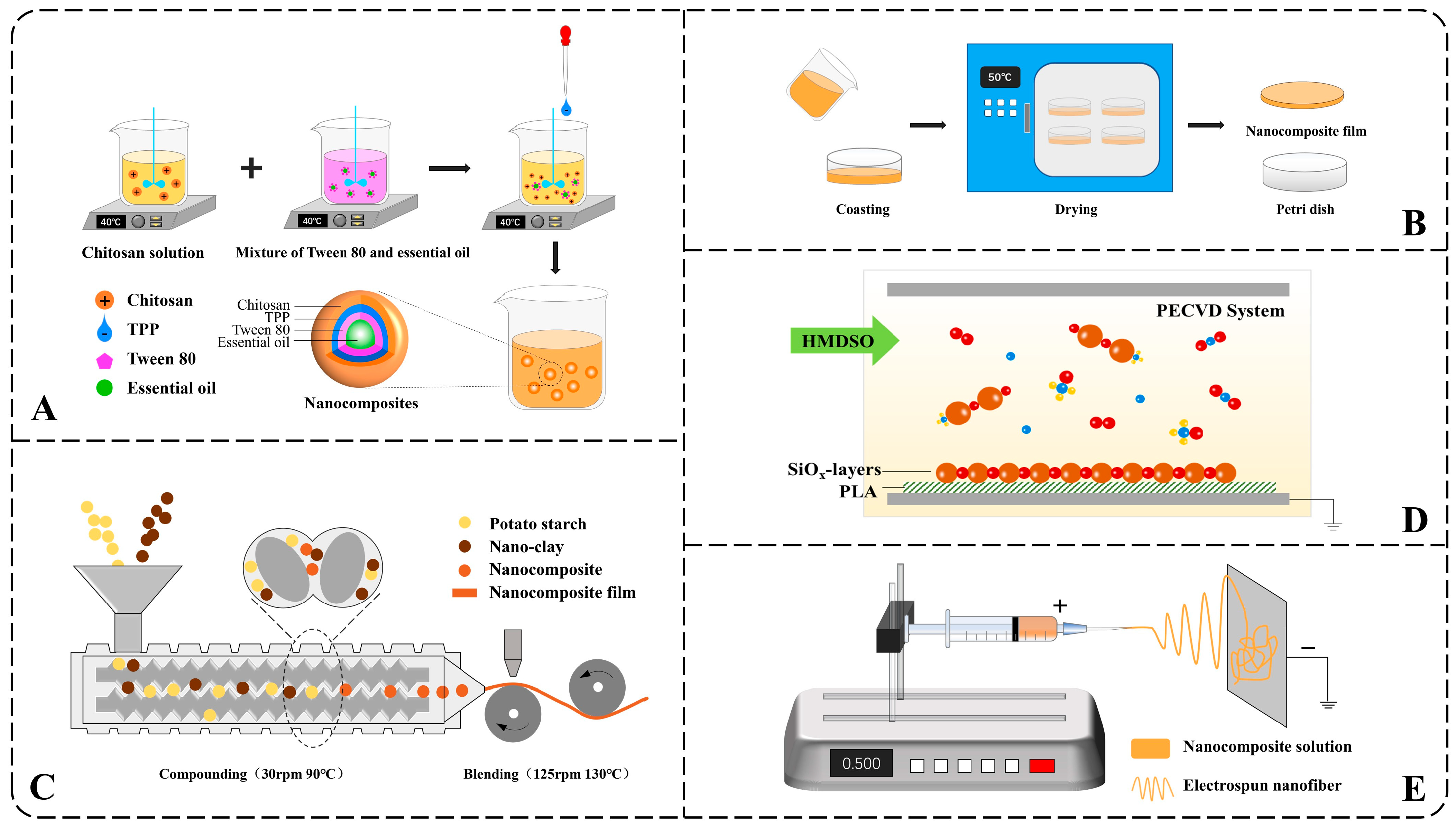 Chicago/Turabian StylePeng, Bo, Xiaohui Qi, Linxiang Qiao, Jingting Lu, Ziyan Qian, Caie Wu, Zhaohui Xue, and Xiaohong Kou. 2025. "Nanocomposite-Enabled Next-Generation Food Packaging: A Comprehensive Review on Advanced Preparation Methods, Functional Properties, Preservation Applications, and Safety Considerations" Foods 14, no. 21: 3688. https://doi.org/10.3390/foods14213688