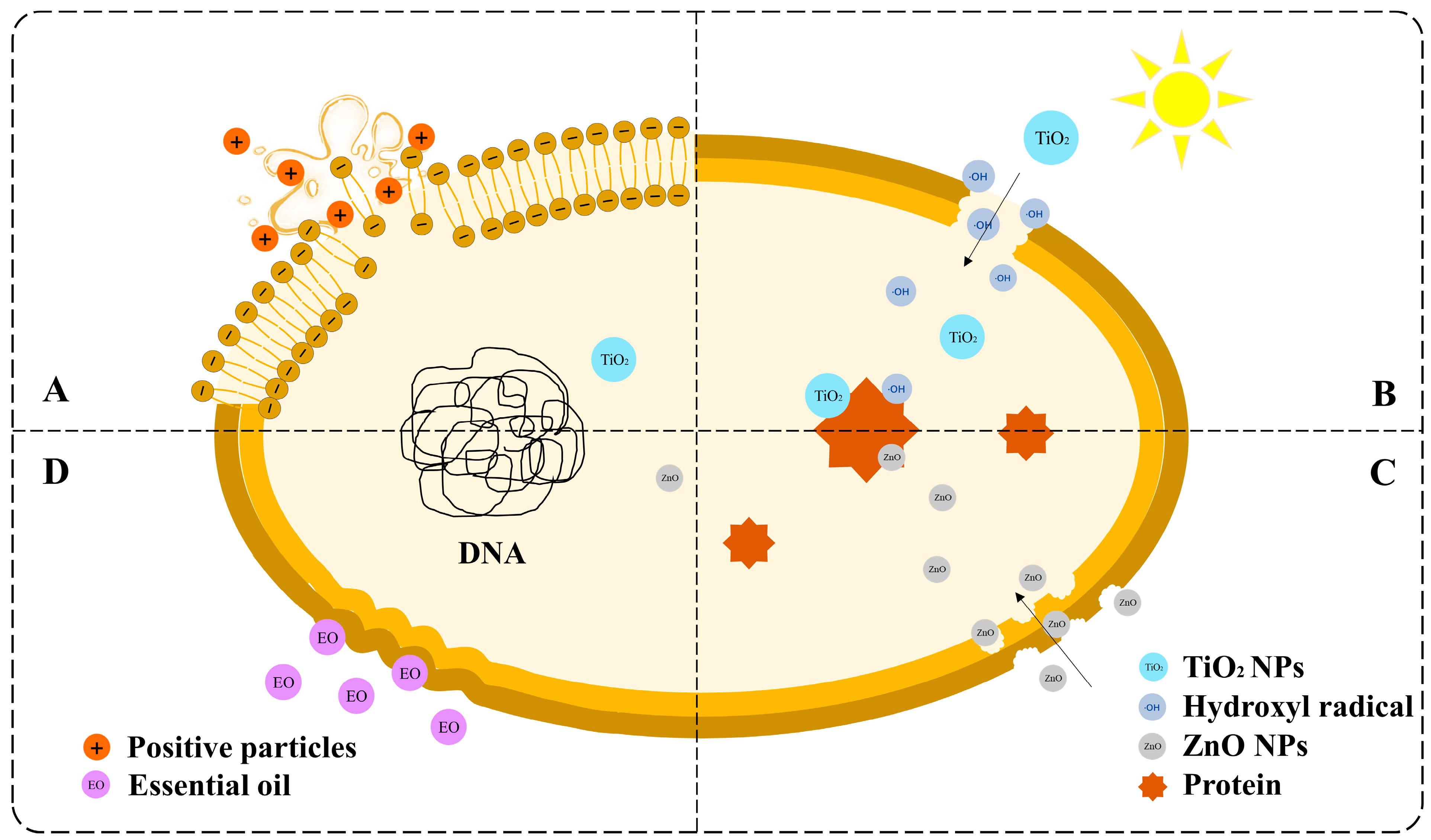 - Sani, M.A.; Ehsani, A.; Hashemi, M. Whey protein isolate/cellulose nanofibre/TiO2 nanoparticle/rosemary essential oil nanocomposite film: Its effect on microbial and sensory quality of lamb meat and growth of common foodborne pathogenic bacteria during refrigeration. Int. J. Food Microbiol. 2017, 251, 8–14. [Google Scholar] [CrossRef]
