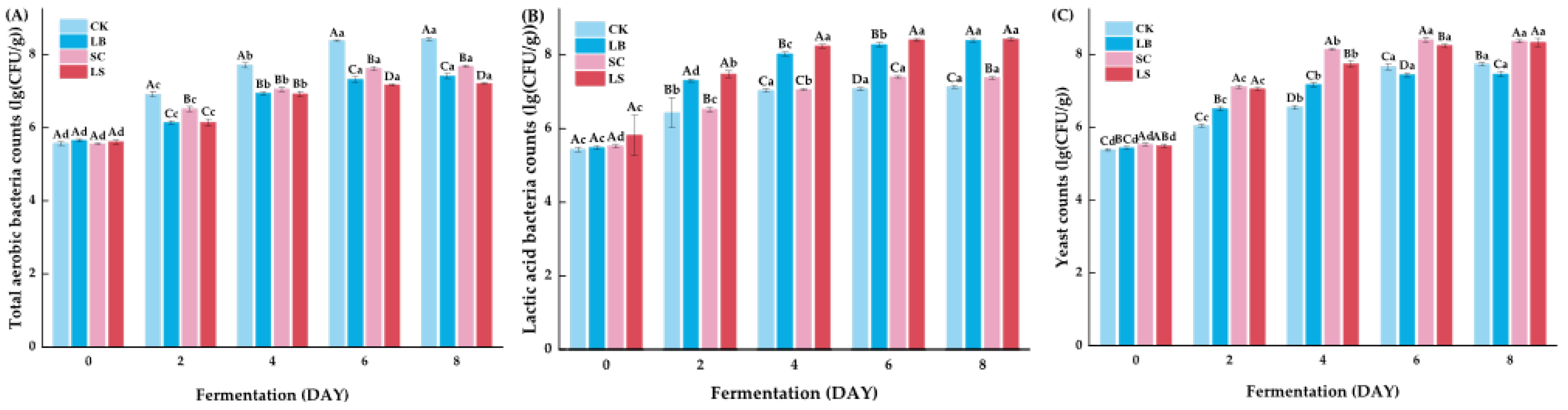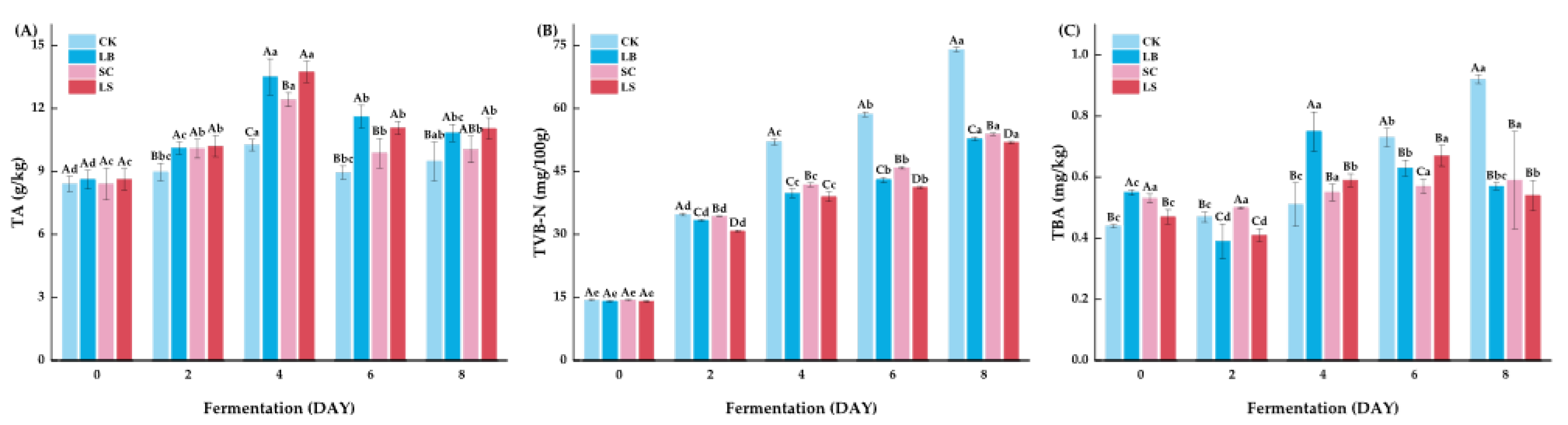 3.2. Physiochemical Parameters of Fermented Large Yellow Croaker