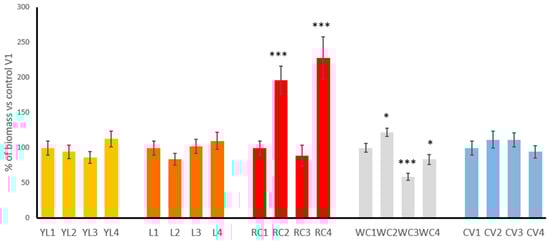 Changes in the biomass of the biofortified sprouts, presented as % of control (i.e., untreated sprouts) (YL—yellow lupine, L—lentil, RC—red clover, WC—white clover, CV—common vetch; 1–4 different variants of biofortification procedure, see Section 2.3 for details). Asterisks indicate statistically significant differences compared to the respective control group: p < 0.05 (*), p < 0.001 (***).