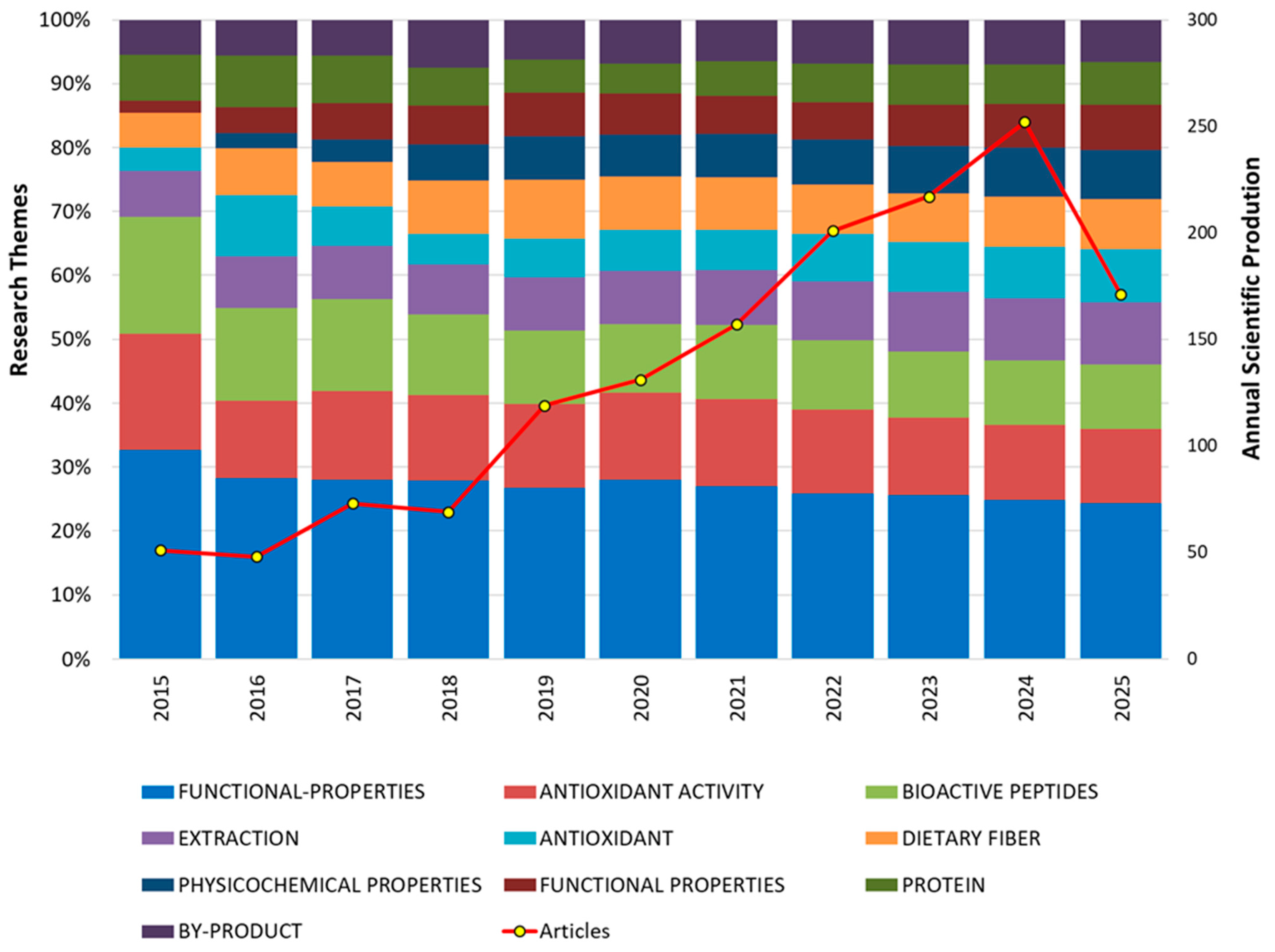 - Functional properties: focused on bioactive compounds and protein functionality (“functional properties”, “bioactive properties”, “bioactive peptides”).