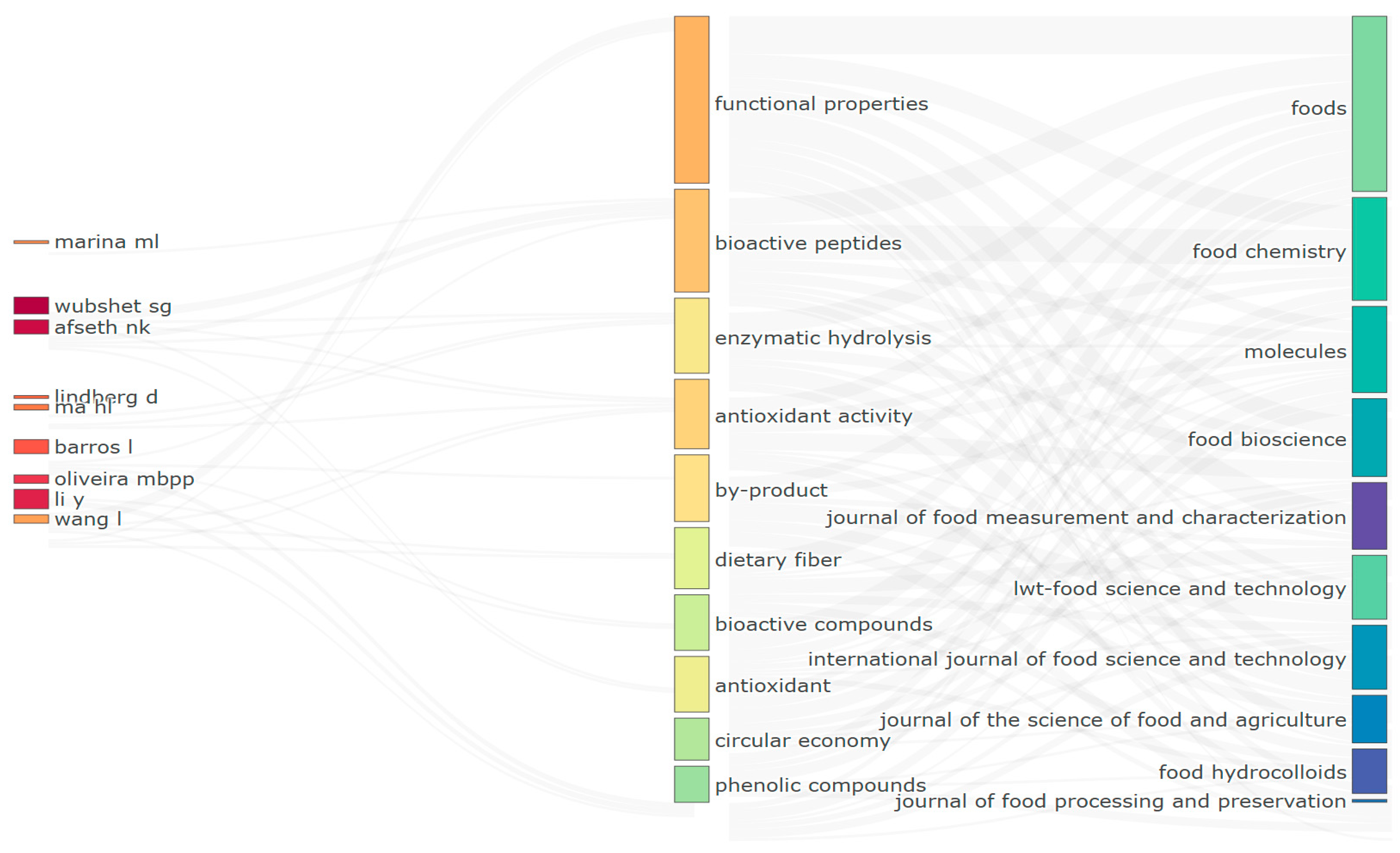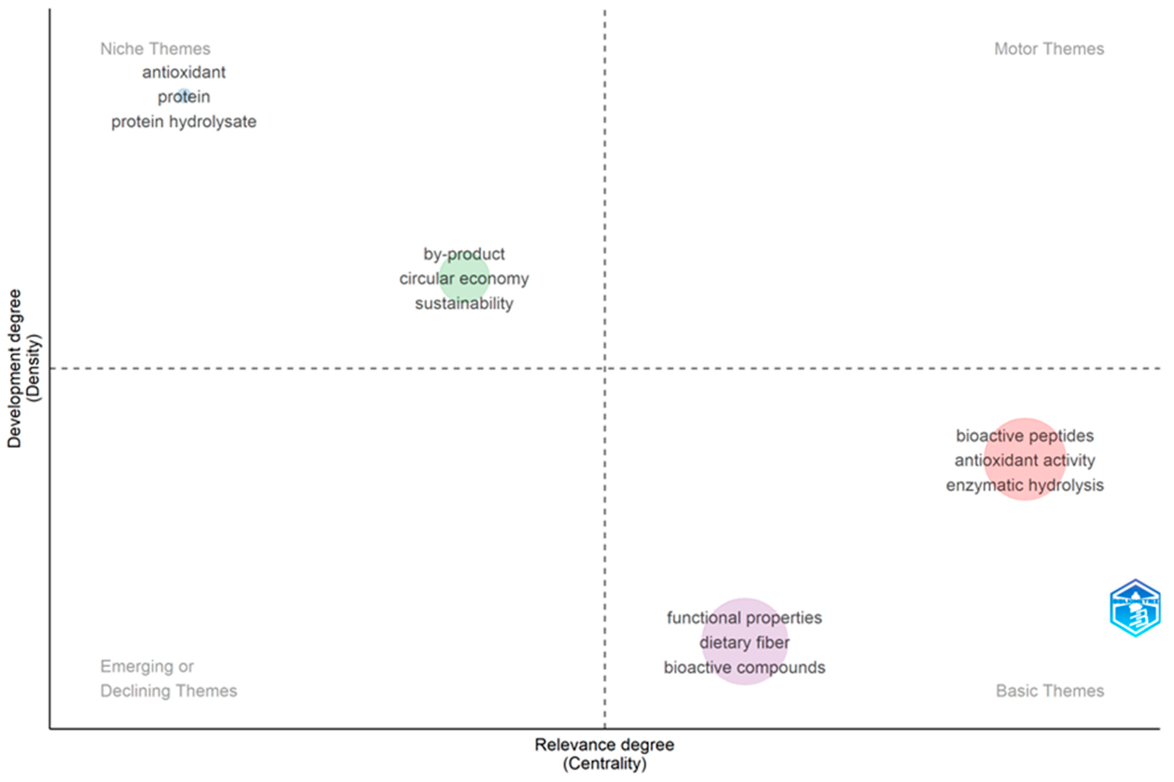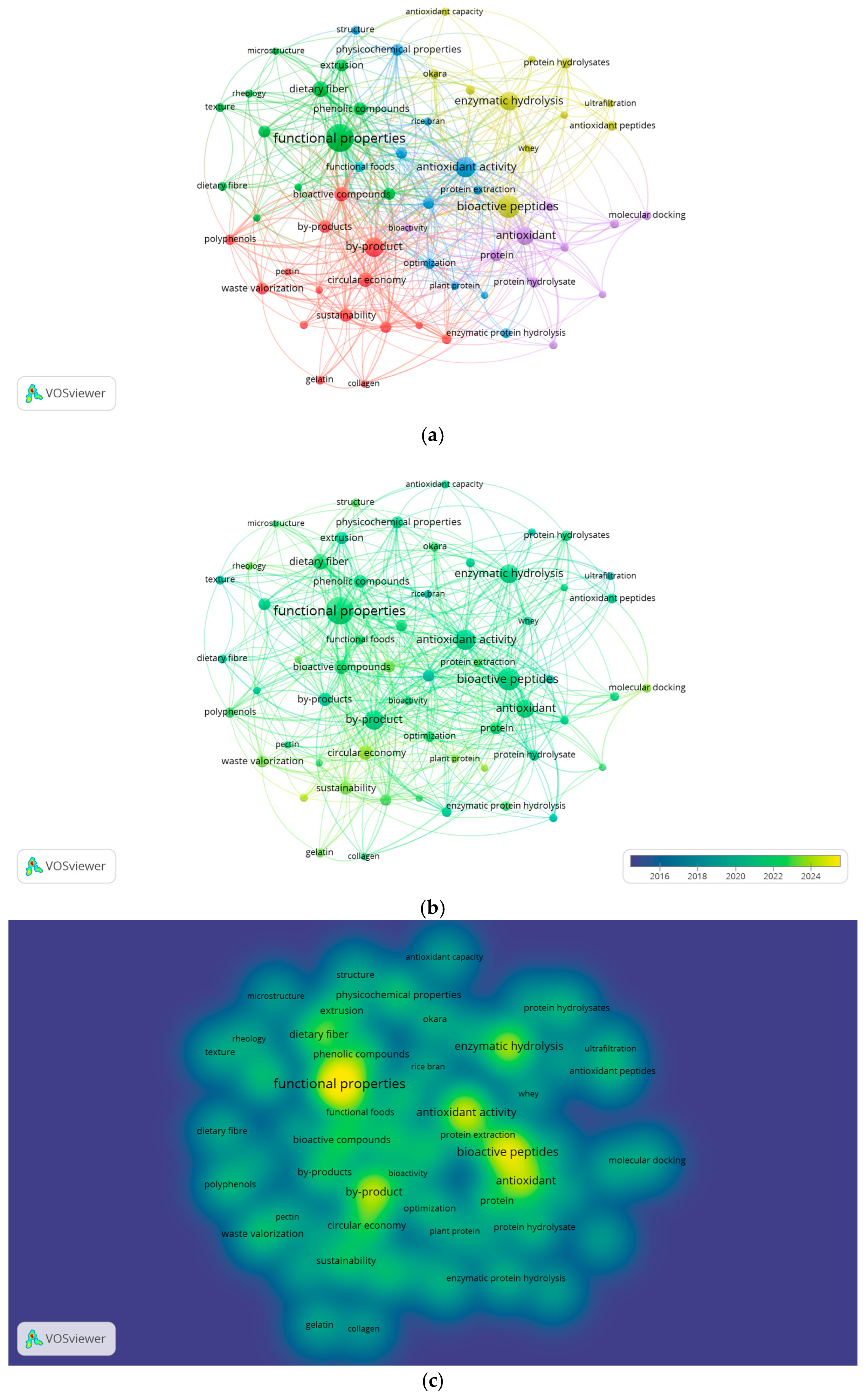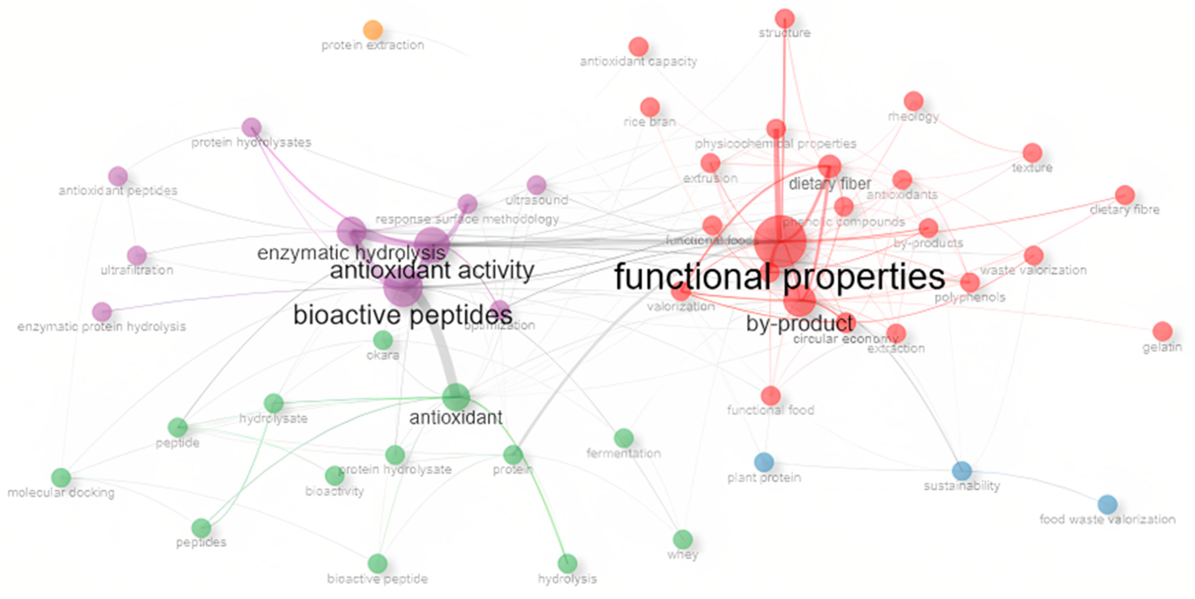 | 4 (Yellow) | 323 | 11 | Enzymatic hydrolysis, bioactive peptides, antioxidant capacity, antioxidant peptides, biological activity, fermentation, okara, protein hydrolysates, protein hydrolysis, ultrafiltration, whey |