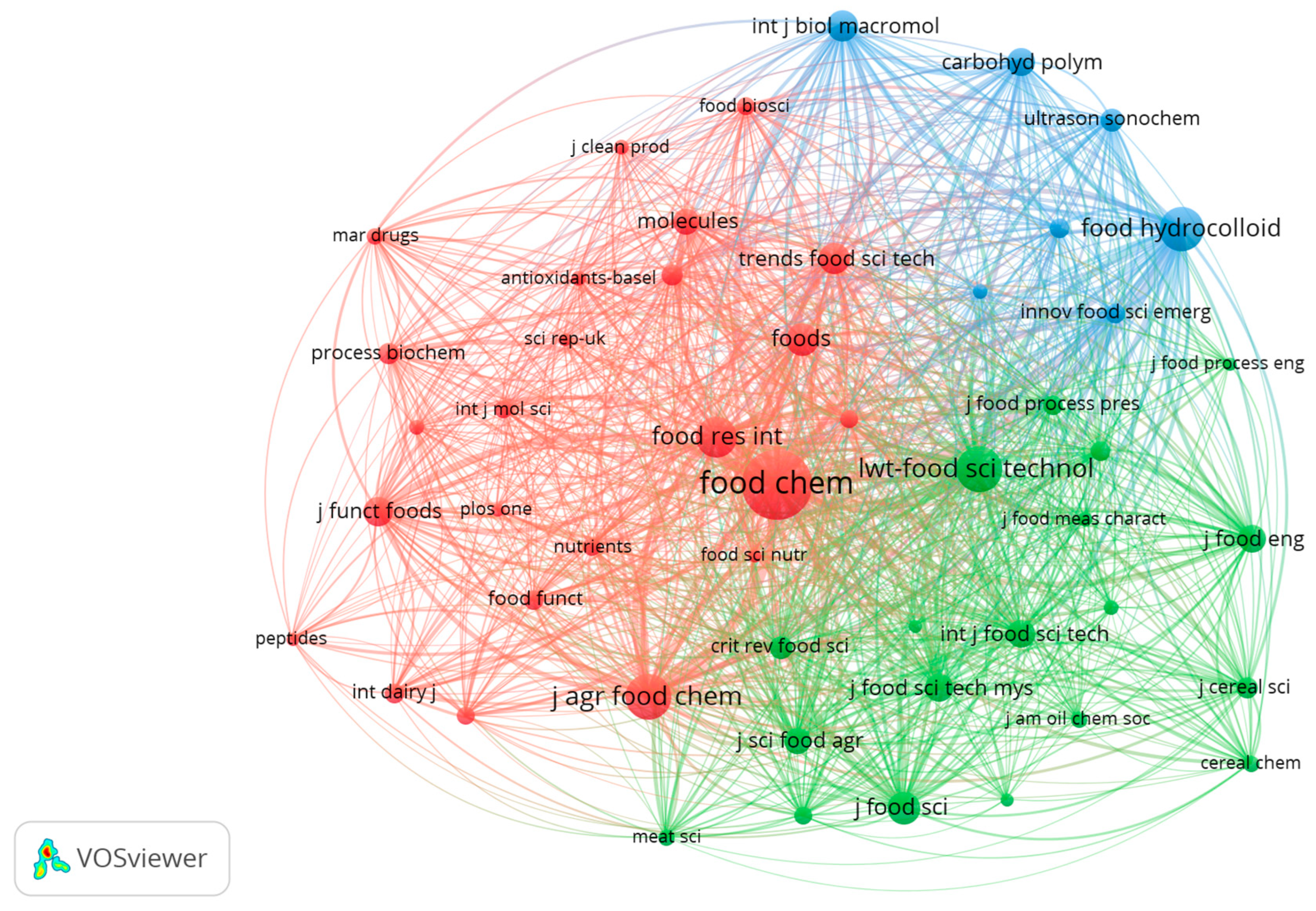 | 3 (Blue) | 283 | 11 | Antioxidant activity, enzymatic protein hydrolysis, optimization, physicochemical properties, plant protein, protein extraction, response surface, methodology, rice bran, structure, techno-functional properties, ultrasound |