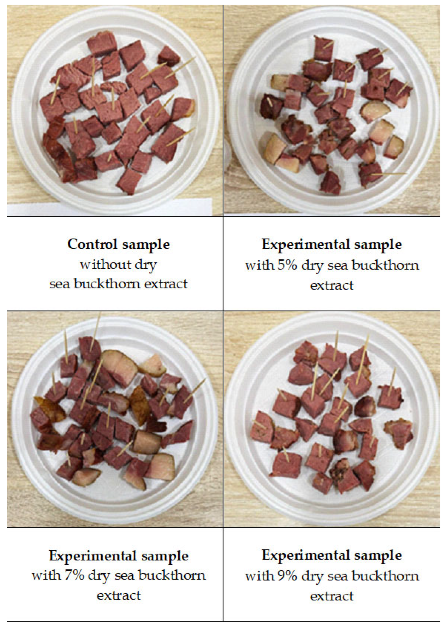 - Anchidin, B.G.; Manoliu, D.R.; Ciobotaru, M.C.; Ciobanu, M.M.; Gucianu, I.; Sandu, G.A.; Boișteanu, P.C. Development of a functional meat product with sea buckthorn oil and analysis of its sensory and physicochemical quality. Sci. Papers Ser. D Anim. Sci. 2023, 66, 370–376. [Google Scholar]