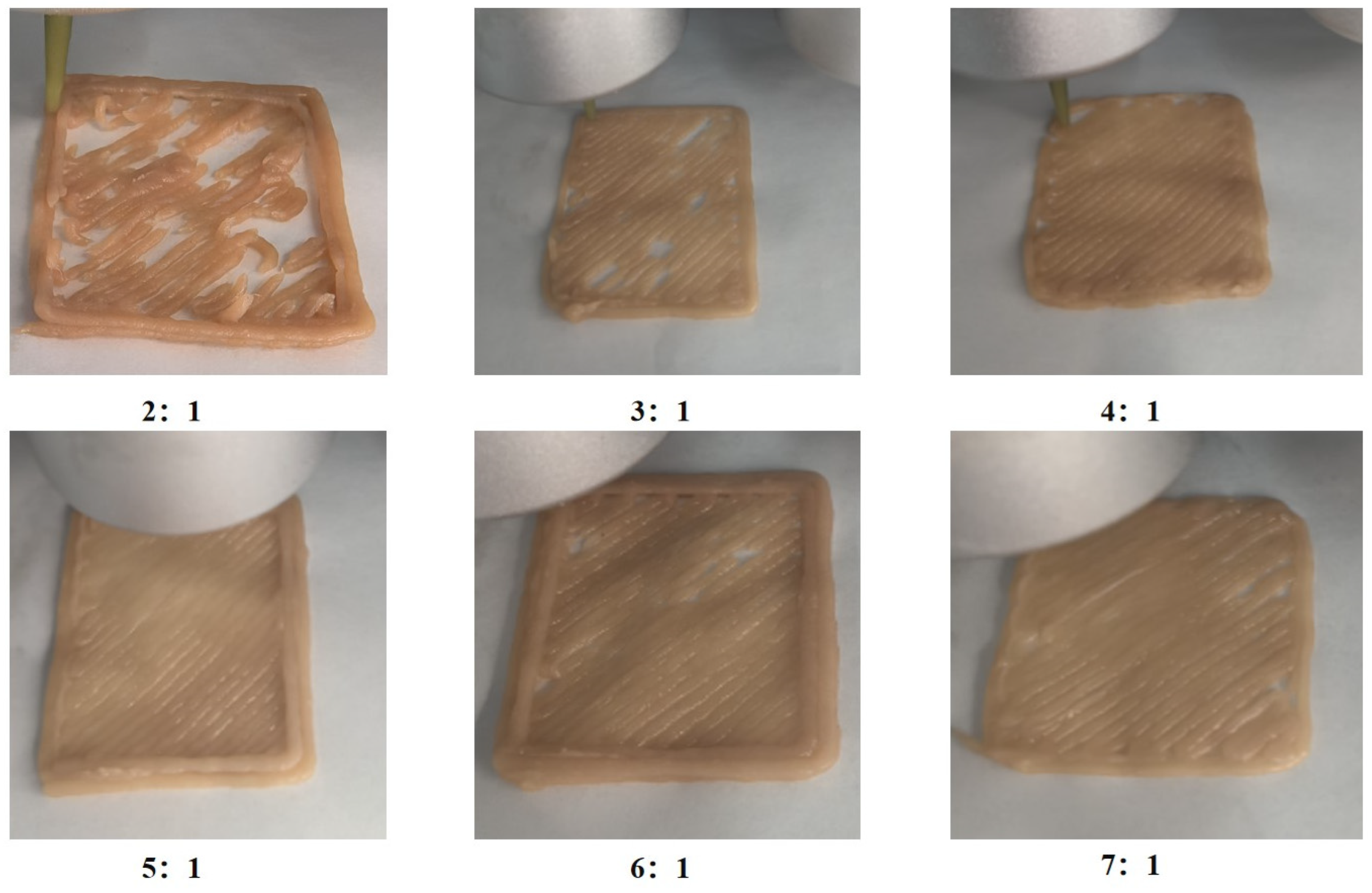 36]. As the proportion of pea protein decreased, print quality initially improved and then gradually deteriorated. The optimal printing outcome was achieved at a ratio of 5:1, characterized by continuous extrusion, absence of clogging or breakage, and a smooth surface finish. However, at lower pea protein concentrations (6:1 and 7:1), occasional filament discontinuities occurred. This phenomenon is likely due to insufficient protein content and excessive water, which reduce viscosity and increase fluidity, thereby weakening cohesion and leading to intermittent material flow during printing [