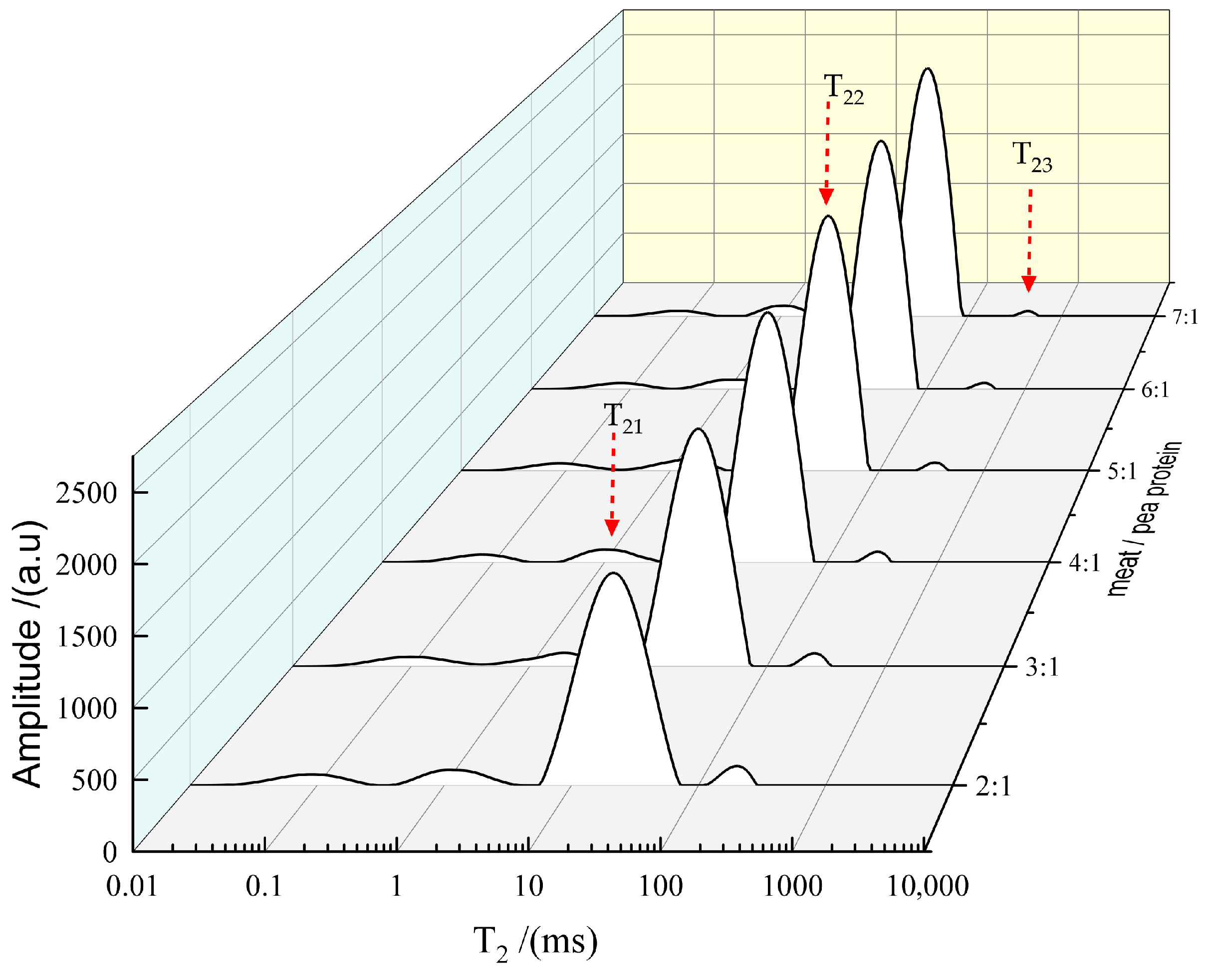 Samples of 3D-printed pork products were wrapped in plastic film and positioned within the instrument chamber for analysis using the IIVTMR 20-010 low-field NMR analyzer from Suzhou Niumag analytical instrument corporation (Suzhou, China). The following parameters were employed for water distribution assessment: sampling frequency of 200 kHz, wait time of 2000 ms, echo time of 0.1 ms, 15,000 echoes, and 16 scan accumulations.