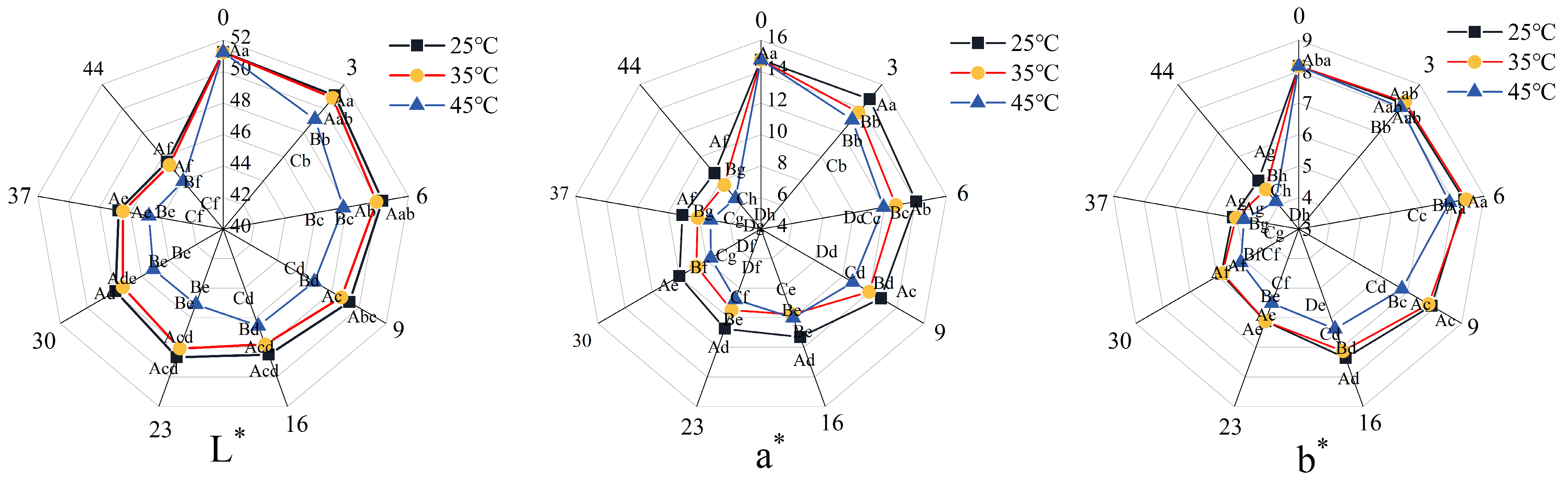 p < 0.05). During the initial 0–6 days, the decline in L*, a*, and b* values was significantly more pronounced in samples stored at 45 °C compared to those at 25 °C and 35 °C (