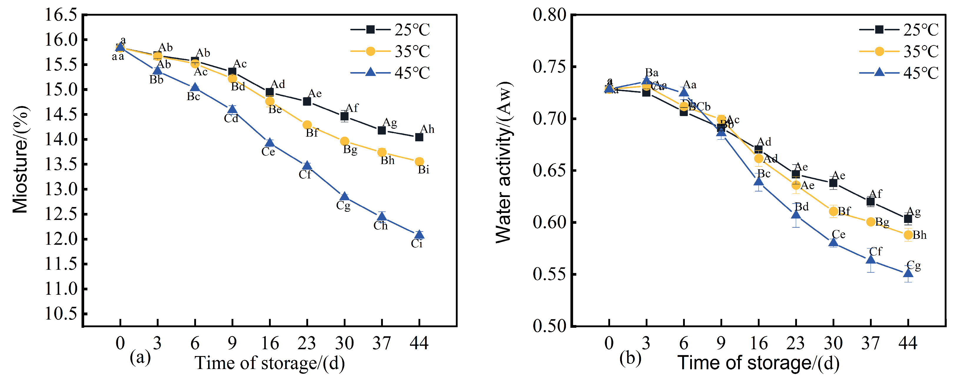 Figure 6a, the moisture content of all three sample groups exhibited a declining trend over the storage period. After 44 days of storage, the moisture contents measured 14.04%, 13.55%, and 12.07%, respectively, which were significantly lower (