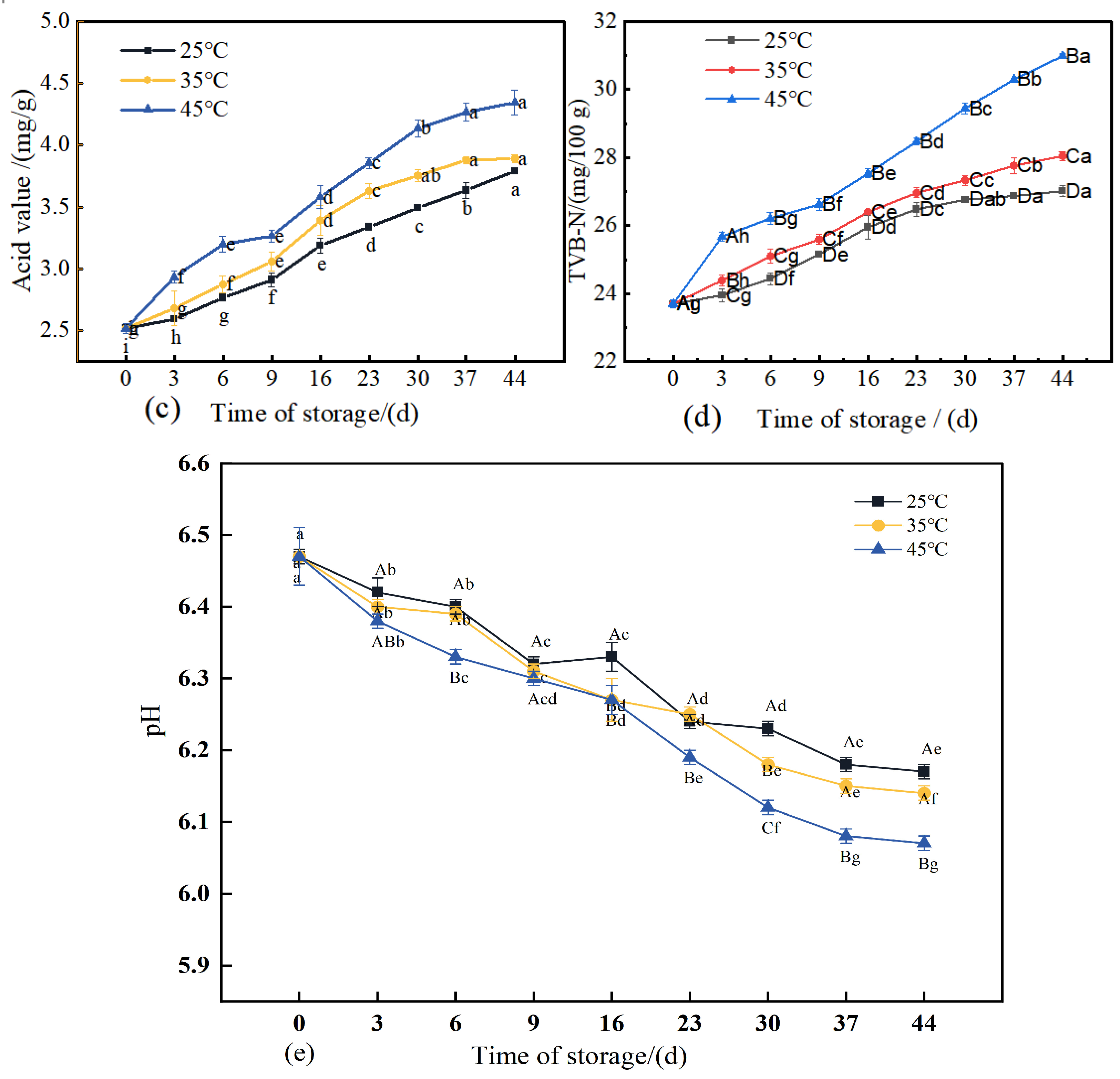 Figure 6e, the pH of 3D-printed meat samples stored at each of the three temperatures demonstrated a significant decreasing trend (