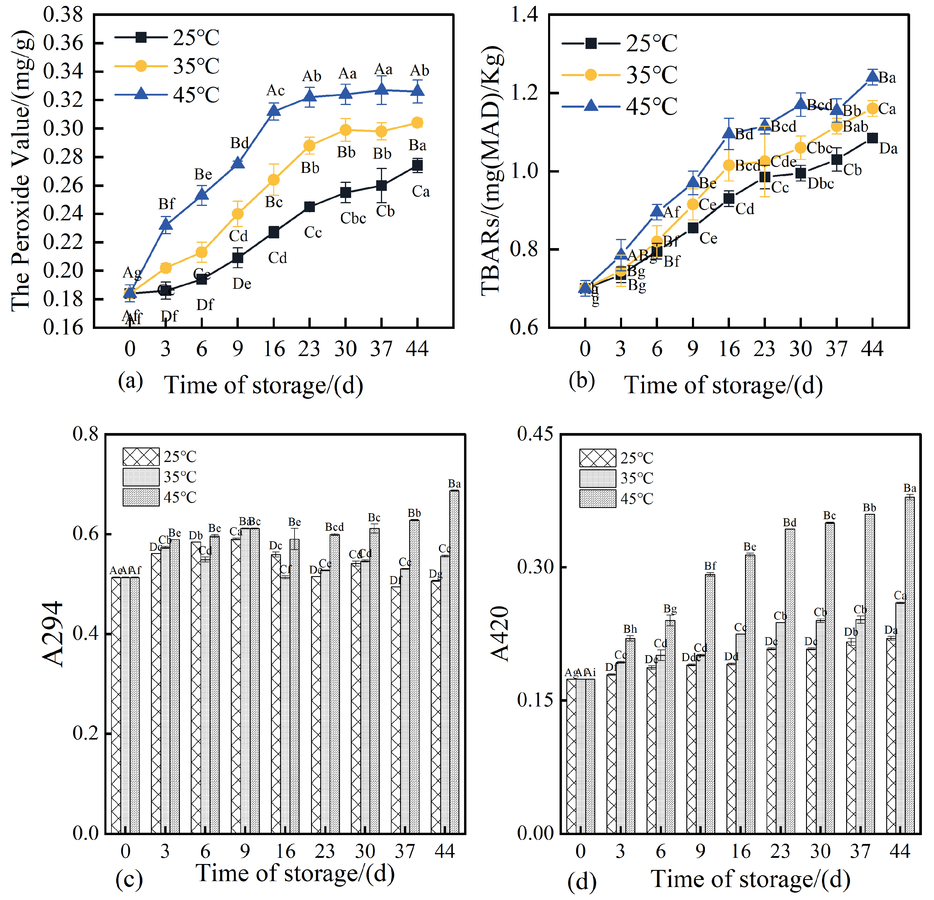 p < 0.05), reaching 0.274, 0.303, and 0.306 mg/g, respectively. This demonstrates that elevated storage temperatures accelerated the rate of lipid oxidation, with higher temperatures corresponding to more rapid increases in PV [