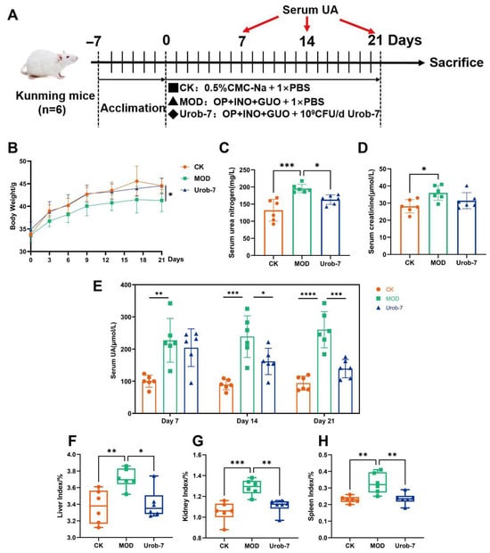 Three-week-old SPF Kunming male mice (Beijing Vital River Laboratory Animal Technology Co., Ltd., Beijing, China) weighing 20 ± 2 g were obtained and acclimated for seven days under conditions including a room temperature of 21 ± 2 °C, humidity maintained at 50 ± 10%, and a 12 h light/dark cycle. They were randomly divided into three groups (n = 6): the control group (CK), the HUA model group (MOD), and the Urob-7 intervention group (Urob-7). All groups were fed a basic maintenance diet for mice (Sipeifu Biotechnology Co., Ltd., Beijing, China) and provided with purified drinking water. The HUA model was established by intragastric administration of 250 mg/kg potassium oxonate (OP), 400 mg/kg inosine (INO), and 400 mg/kg guanosine (GUO), administered as a dispersion in 0.5% (w/v) carboxymethylcellulose sodium (CMC-Na). To assess its preventive potential, Limosilactobacillus reuteri Urob-7 was administered intragastrically to the Urob-7 group at a dose of 109 CFU/d starting from the modeling initiation. The CK group received an equal volume of 1 × PBS and 0.5% (w/v) CMC-Na daily. On the 7th, 14th, and 21st days, blood samples were collected from the mice’s orbital sinus, and serum uric acid levels were quantified using a uric acid detection kit (Nanjing Jiancheng, Nanjing, China). On the 21st day following the blood sampling, the mice were anesthetized with isoflurane and euthanized by cervical dislocation. Feces, liver, kidney, spleen, and intestinal tissues were collected and stored at −80 °C until analysis. All experiments were approved by the Animal Care and Use Committee of China Agricultural University and conformed to the Guide for the Care and Use of Laboratory Animals (Approval number: AW42604202-5-1).