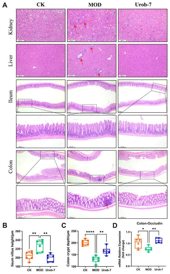 Histopathological analysis (Figure 3A) showed that MOD group mice exhibited marked renal damage, characterized by incomplete glomerular morphology, capillary loop expansion, Bowman’s capsule swelling, and mild inflammatory infiltration. Hepatic sections from MOD mice showed turbid cytoplasm, red blood cell stasis in sinusoids, significant inflammatory infiltration, and variable-sized fat vacuoles. As for the intestines, the colon structure in MOD group mice was distorted with shortened crypts, and marked inflammatory infiltration. Compared with the CK group, the MOD group exhibited a significant increase in ileum villus height. In contrast, Urob-7 group mice showed less severe kidney damage, with neatly arranged proximal tubular epithelial cells and clearer cytoplasm. Urob-7 intervention also reduced hepatic fat deposition and inflammation, leading to more regular and uniform hepatocyte morphology. Compared with the MOD group, ImageJ analysis further confirmed that mice in the Urob-7 group exhibited significantly reduced ileum villus height and increased colon crypt depth (Figure 3B,C). Additionally, the expression level of Occludin was higher in the Urob-7 group than in the MOD group (Figure 3D), indicating that Urob-7 could ameliorate intestinal pathological changes induced by HUA. Overall, these findings suggested that L. reuteri Urob-7 intervention effectively alleviated HUA-induced pathological changes and inflammation in the liver, kidneys, and intestines.