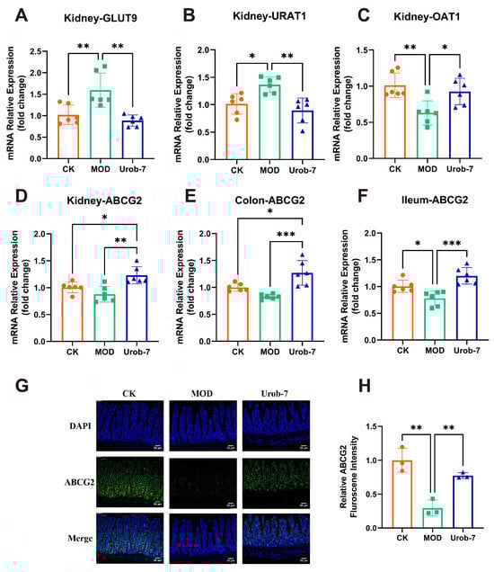 To investigate the effects of L. reuteri Urob-7 on uric acid metabolism, re-absorption transporters (GLUT9 and URAT1) and excretion transporters (ABCG2 and OAT1) were analyzed. The results showed that mRNA levels of GLUT9 and URAT1 significantly increased by 56.57% and 34.45%, while mRNA levels of OAT1 and ABCG2 decreased by 37.62% and 12.61% in the MOD group (Figure 4A–D). Moreover, ABCG2 expression in the ileum and colon of MOD group also significantly decreased (Figure 4E,F). L. reuteri Urob-7 intervention reversed these changes by significantly down-regulating the mRNA expression of GLUT9 and URAT1 and upregulating OAT1 and ABCG2 in the kidney. Furthermore, ABCG2 expression in the intestinal tissues was significantly upregulated. Immunofluorescence analysis confirmed that ABCG2 protein expression in the ileum of the Urob-7 group was significantly higher than in the MOD group (Figure 4G,H). These findings suggested that L. reuteri Urob-7 effectively promoted uric acid excretion and reduced uric acid reabsorption by regulating the expression of these key transporters, thereby alleviating HUA.