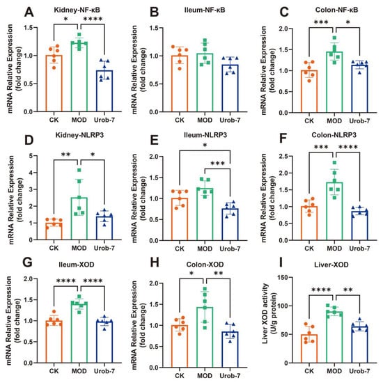 The expressions of inflammatory signaling pathways and key enzymes in uric acid metabolism were evaluated in three groups of mice (Figure 5A–F). The results showed that the gene expression of NF-κB was significantly upregulated in the kidney and colon of the MOD group, increasing by 39.30% and 43.63% respectively compared with the CK group. Similarly, the mRNA expression levels of NLRP3 in the kidney and colon of MOD group mice were also significantly upregulated. However, there were no significant differences in NF-κB expression among the three groups in the ileum, and significant differences in NLRP3 expression were only observed between the Urob-7 group and the other two groups. Notably, L.reuteri Urob-7 intervention effectively down-regulated the gene expression at the mRNA level, restoring the levels of NF-κB and NLRP3 in the kidney and colon to levels similar to those of the CK group.
