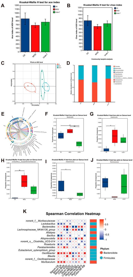 To illustrate the effect of L. reuteri Urob-7 on the gut microbiota composition in HUA mice, the diversity and abundance of gut microbiota were detected in fecal samples via 16S rRNA sequencing. Compared with the CK group, the Ace index and Chao index of mice in the MOD group decreased but did not exhibit a significant difference. The Ace index and Chao index of the Urob-7 group increased compared with those of the MOD group mice, but did not restore to the same level as the CK group (Figure 6A,B). A principal coordinates analysis (PCoA) showed a significant difference between the CK and MOD groups at the ASV level (PCoA 1 = 16.92%, PCoA 2 = 14.82%) (Figure 6C). Moreover, the Urob-7 group exhibited a trend towards the separation and clustering of microbiota structures from the MOD group, indicating L. reuteri Urob-7 treatment may change the gut microbiota composition. In addition, compared to the CK group, the relative abundance of Firmicutes and Actinobacteriota was significantly reduced, while that of Bacteroidetes was significantly increased in the MOD group (Figure 6D). The administration of L. reuteri Urob-7 reversed this imbalance and restored the ratio of Bacteroidetes to Firmicutes (Bac/Firm Ratio) to the level of the CK group. At the genus level, the circus plot analysis showed that norank_f__Muribaculaceae, unclassified_f__Lachnospiraceae, Lactobacillus, Bacteroides, Lachnospiraceae_NK4A136_group, and Alistipes are the shared core genera in the three groups of mice (Figure 6E). Furthermore, compared with the CK group, the relative abundance of Bacteroides, unclassified_f__Erysipelatoclostridiaceae, and Anaerovorax significantly increased (p < 0.05) in the MOD group, while the relative abundance of Ruminococcus and Intestinimonas significantly decreased (p < 0.05) (Figure 6F–J). The Spearman correlation heatmap analysis showed that the relative abundance of Bacteroides was positively correlated with serum biomarker concentrations (UA, CR, and BUN), XOD expression, and inflammation-related genes, while negatively correlated with ABCG2 expression in the ileum and colon (Figure 6K). These results suggested that Urob-7 intervention effectively reversed the HUA-induced imbalance in gut microbiota.