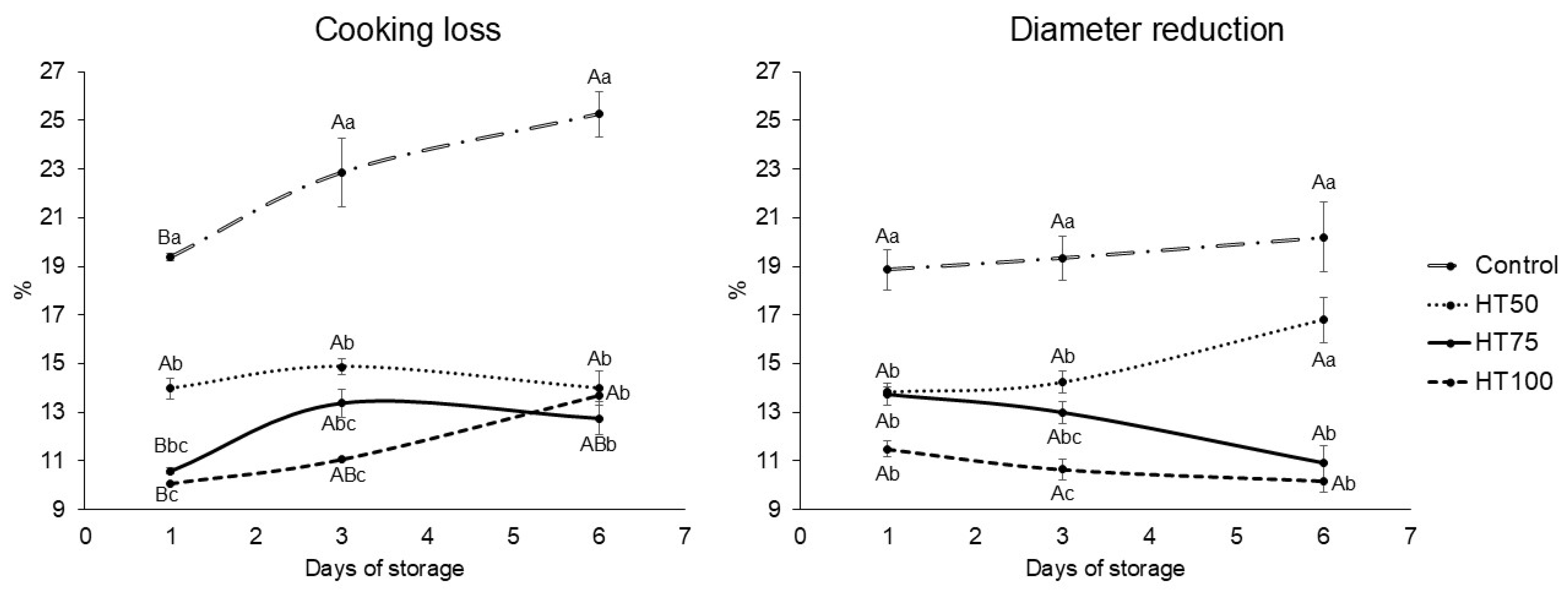 | b* | 1 | 8.1 ± 0.3 Aa | 9.2 ± 0.3 Aa | 8.9 ± 0.3 Aa | 8.5 ± 0.3 Aa |