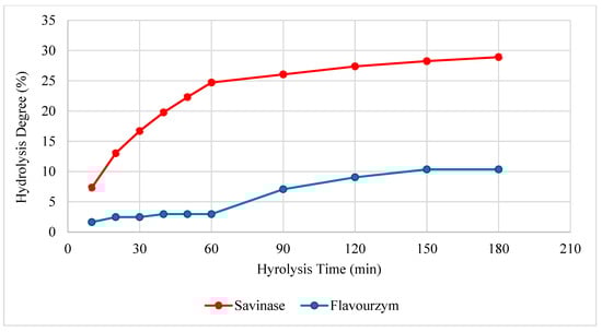 Degree of hydrolysis of aquafaba protein hydrolysates obtained by flavourzyme and savinase enzyme treatment.