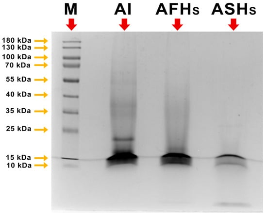 SDS-PAGE Image of aquafaba protein isolate and hydrolysates. M: Protein marker (Thermo Fisher Scientific, wide range 10,000–180,000 Da), AI: Aquafaba protein isolate, AFHs: Aquafaba hydrolysate obtained by flavourzyme enzyme treatment, ASHs: Aquafaba hydrolysate obtained by savinase enzyme treatment.