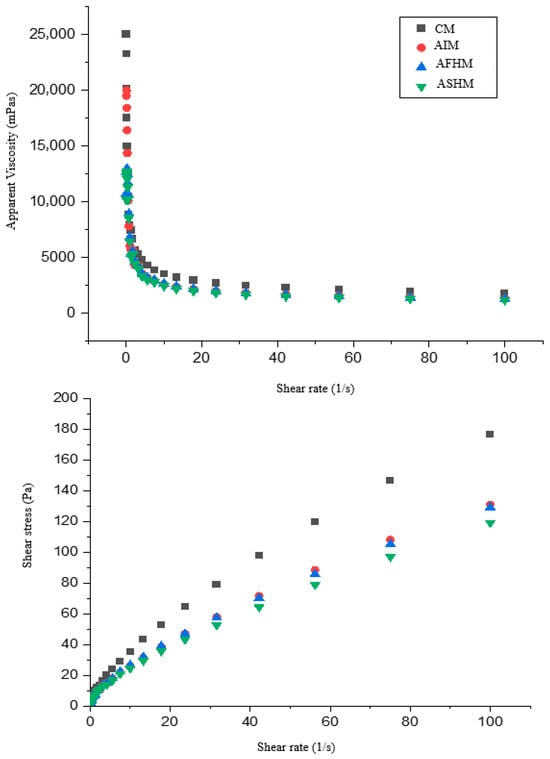 In all samples, viscosity decreased as the shear rate increased, meaning that the doughs exhibited shear thinning (pseudoplastic) behavior (Figure 3). The control (CM) had the highest viscosity, while the enzyme hydrolysates (AFHM, ASHM), in particular, exhibited lower viscosity. This indicates that addition of hydrolyzed protein made the dough more fluid. Shear stress increases with shear rate; while the control sample yielded the highest values, enzyme-hydrolyzed doughs exhibited lower shear stress. Although the differences between AIM, AFHM, and ASHM are small, the lowest values are generally found in ASHM. The control dough is denser and more viscous, while the aquafaba isolate and especially the enzyme hydrolysates made the dough more fluid (Figure 3). Previous studies have demonstrated that the incorporation of proteins and their hydrolysates into cake batters can markedly influence batter flow properties [55]. Consistent with our findings, Sung et al. [56] reported that the addition of soy protein concentrate (3–24%) to sponge cake led to a decrease in viscosity proportional to the increase in protein content. This may also be associated with the increased oil and water-binding capacity of protein hydrolysates compared to intact proteins.