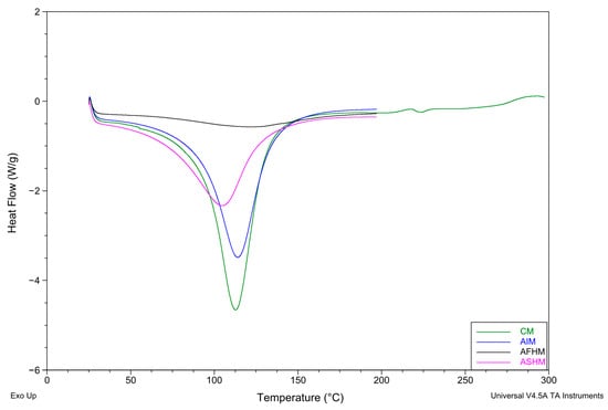 Thermal properties of muffin cake samples. CM: Control muffin cake, AIM: Muffin cake substituted with aquafaba protein isolate, AFHM: Muffin cake substituted with aquafaba hydrolysate obtained by flavourzyme enzyme treatment, ASHM: Muffin cake substituted with aquafaba hydrolysate obtained by alcalase enzyme treatment.