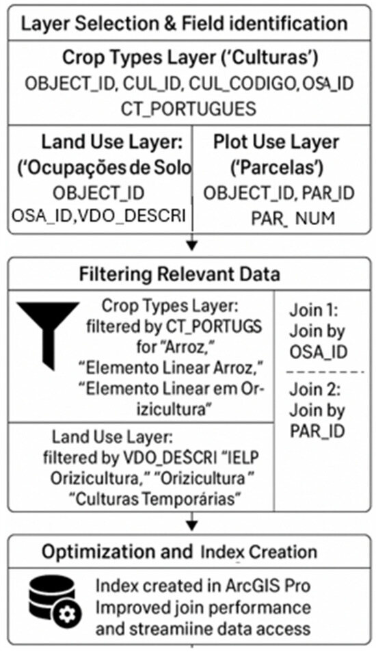 - Layer Selection and Field IdentificationThree spatial data layers from the IFAP database were used: Crop Types Layer (“Culturas”)—includes fields: OBJECT_ID, CUL_ID, CUL_CODIGO, OSA_ID, CT_PORTUGUÊS; Land Use Layer (“Ocupações de Solo”)—includes fields: OBJECT_ID, OSA_ID, VDO_DESCRI, PAR_ID; Plot Locations Layer (“Parcelas”)—includes fields: OBJECT_ID, PAR_ID, PAR_NUM.