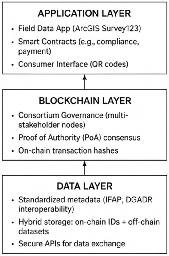 - The Data Layer establishes standardized data schemas and metadata for interoperability with national agricultural databases (e.g., IFAP, DGADR in Portugal), enabling hybrid on-chain/off-chain data storage through secure APIs.