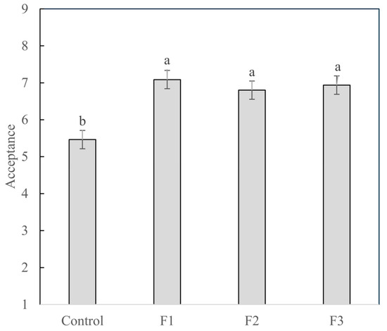 The results of overall liking are shown in Figure 1. Fresh sausages with added BP (F1, F2, and F3) showed average overall liking scores between 7.2 and 6.8, which were significantly higher (p < 0.05) than the scores for samples without the colorant.