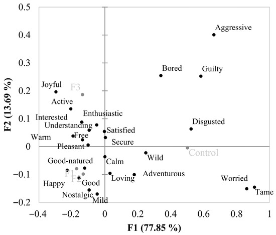 The results show that samples with added BP were placed on the opposite side of the biplot graph (Figure 2) from the control samples. F3 evoked mainly “Joyful”, “Warm”, “Free”, “Secure”, “Active”, “Pleasant”, “Enthusiastic”, and “Interested”, which present positive valence [14]. F2 and F3 evoked “Happy”, “Nostalgic”, “Good”, and “Good-natured”, which are also positive emotions. Rocha et al. [34] also observed that frankfurters with health claims evoke positive emotions. “Mild” was located close to F1 and F2, whereas “Understanding” was located close to F3. Both emotions are considered to have no clear classification, with their connotation depending on the product and context [15,16].