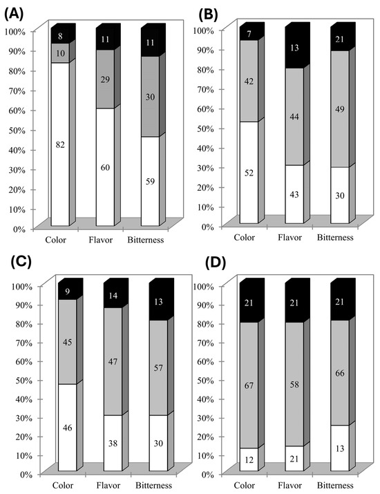 Ávila et al. [36] indicated that a proportion of citations above 70% means that the attribute exerts a strong influence on the overall impression, whereas below 20% the attribute should not be considered significant for the overall impression. Thus, considering the negative impact on liking when color, flavor, and bitterness were below the ideal level (Table 2), the results from the JAR test indicate that the F3 formulation was the most suitable to be considered for further studies, which is in line with the results in Figure 1.