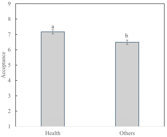 Consumer behavior and attitudes toward food involve complex decision-making processes, and their segmentation is essential nowadays for the proper evaluation of how consumers react to foods, enabling the food industry to better target specific demographic groups and refine logistics and marketing strategies [42,43]. In the present work, consumers were split into two purchasing groups: those who claimed healthiness as a purchasing driver of the samples and those who claimed other motivations. This segmentation resulted in a sample distribution close to 50% (the health-oriented segment was composed of 51.6% (n = 47) and other drivers of 48.4% (n = 44)). Although sample sizes in the two segments were not as large as recommended for consumer tests, they exceeded the minimum of 40 for stable estimates [44], and these sample sizes have been used before to explore consumers’ behavior in food acceptance studies [45,46].