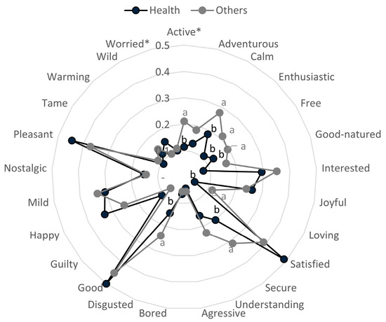 Portion of citation of emotion items for the different clusters of drivers of purchasing. a,b Different letters indicate statistical differences among clusters according to the GLM test. * presented significant differences in the interaction of cluster sample (p < 0.05) in the deviance analysis.