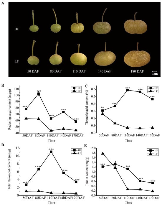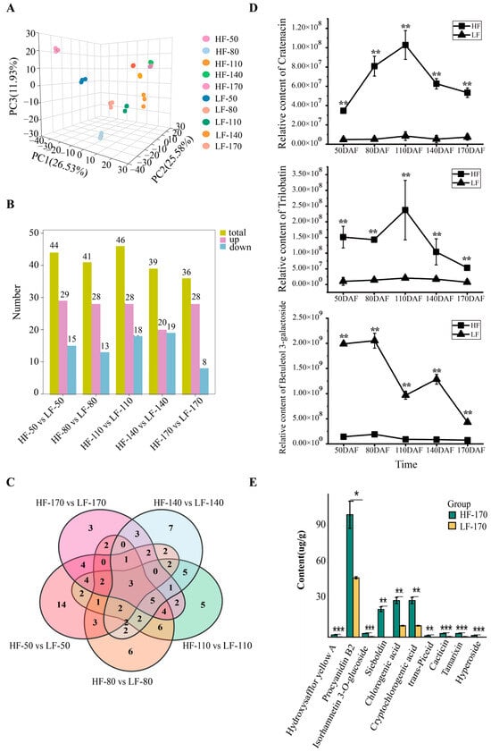 3.1. Metabolite Accumulation in the Flesh of Two Pear Varieties