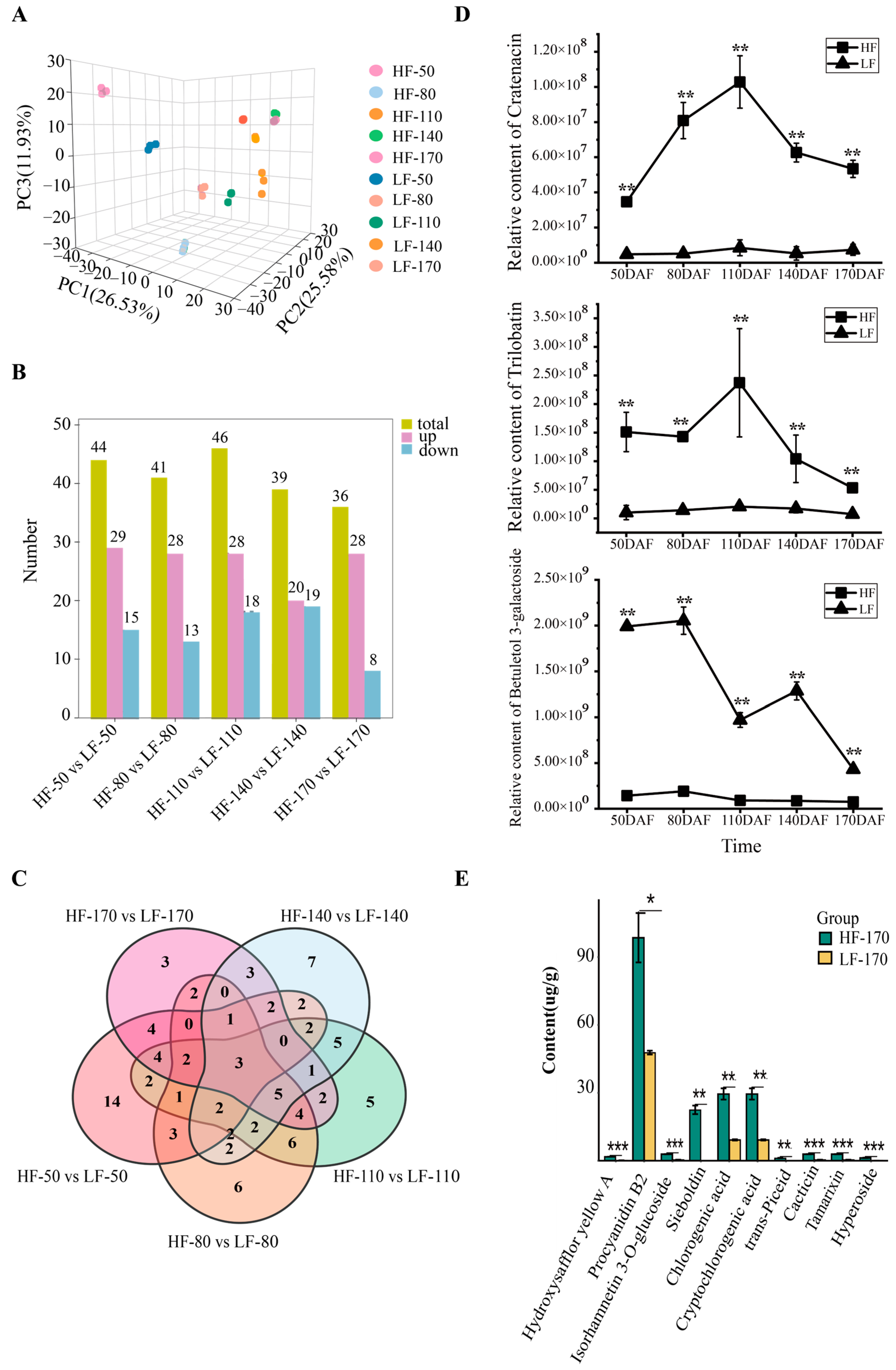4.1. Metabolic Profiling: The Composition, Concentration and Accumulation Patterns of Flavonoids Vary Among Different Pear Varieties