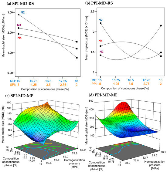 Effect of continuous phase composition and homogenization method on mean droplet size. SPI: soy protein isolate; PPI: pea protein isolate; MD: maltodextrin 10DE; RS: rotor–stator; MF: microfluidization. N2 (7000 rpm), N3 (11,000 rpm), and N4 (15,500 rpm).