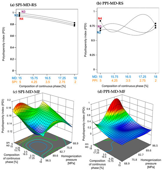 Effect of continuous phase composition and homogenization method on the polydispersity index. SPI: soy protein isolate; PPI: pea protein isolate; MD: maltodextrin 10DE; RS: rotor–stator; MF: microfluidization. N2 (7000 rpm), N3 (11,000 rpm), and N4 (15,500 rpm).