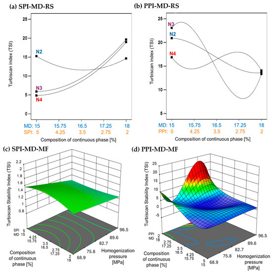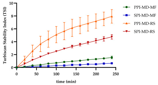 Effect of continuous phase composition and homogenization method on the Turbiscan Stability Index (TSI). SPI: soy protein isolate; PPI: pea protein isolate; MD: maltodextrin 10DE; RS: rotor–stator; MF: microfluidization. N2 (7000 rpm), N3 (11,000 rpm), and N4 (15,500 rpm).