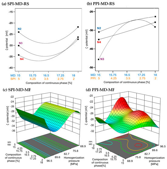 Effect of continuous phase composition and homogenization method on ζ potential. SPI: soy protein isolate; PPI: pea protein isolate; MD: maltodextrin 10DE; RS: rotor–stator; MF: microfluidization. N2 (7000 rpm), N3 (11,000 rpm), and N4 (15,500 rpm).