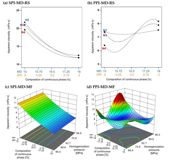 Effect of continuous phase composition and homogenization method on apparent viscosity. SPI: soy protein isolate; PPI: pea protein isolate; MD: maltodextrin 10DE; RS: rotor–stator; MF: microfluidization. N2 (7000 rpm), N3 (11,000 rpm), and N4 (15,500 rpm).
