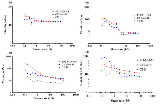 Viscosity vs. shear rate curves of optimized emulsions, non-homogenized and homogenized continuous phase. (a) SPI-MD-RS; (b) PPI-MD-RS; (c) SPI-MD-MF; (d) PPI-MD-MF. CP Non-H: non homogenized continuous phase; CP H: homogenized continuous phase.