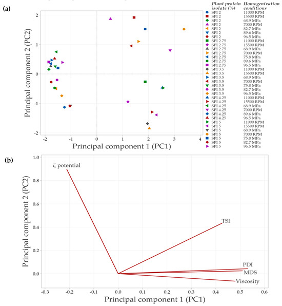 Principal component analysis (PCA) of emulsions prepared with soy protein isolate (SPI) at different concentrations and homogenization conditions. (a) Distribution of emulsions based on the concentration of plant protein isolate and the specific homogenization conditions used. (b) Correlation of the evaluated response variables with the principal components, shown in a bioplot. Response variables include mean droplet size (MDS), polydispersity index (PDI), Turbiscan Stability Index (TSI), ζ-potential, and apparent viscosity.