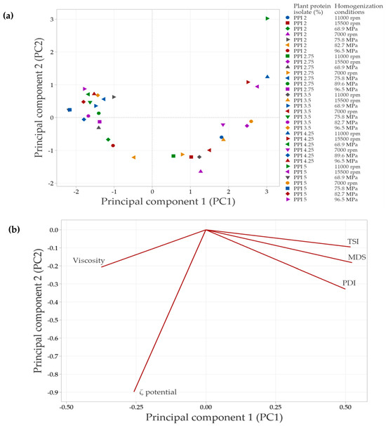 Principal component analysis (PCA) of emulsions prepared with pea protein isolate (PPI) at different concentrations and homogenization conditions. (a) Distribution of emulsions based on the concentration of plant protein isolate and the conditions of homogenization. (b) Correlation of response variables evaluated with the principal components (bioplot). The response variables include mean droplet size (MDS), polydispersity index (PDI), Turbiscan Stability Index (TSI), ζ-potential and apparent viscosity.